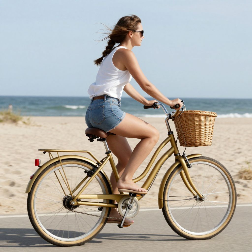 Woman riding a golden beach cruiser bicycle along the sandy shore, her wicker basket perched securely on the rear rack, her hair flowing in a braid as she enjoys the coastal breeze.