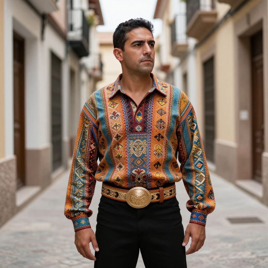 Photograph of a medium-built man with short black hair, wearing an ornate, multicolored, long-sleeved shirt with intricate patterns in orange, blue, and red, paired with black pants and a large, gold-buckled belt. He stands confidently in a narrow, cobblestone alley between beige and brown buildings with dark wooden doors and small balconies. The background is slightly blurred, emphasizing the subject. His expression is serious and focused, with a slight upward gaze. The alley's texture contrasts with the vibrant, detailed fabric of his shirt, creating a striking visual effect.