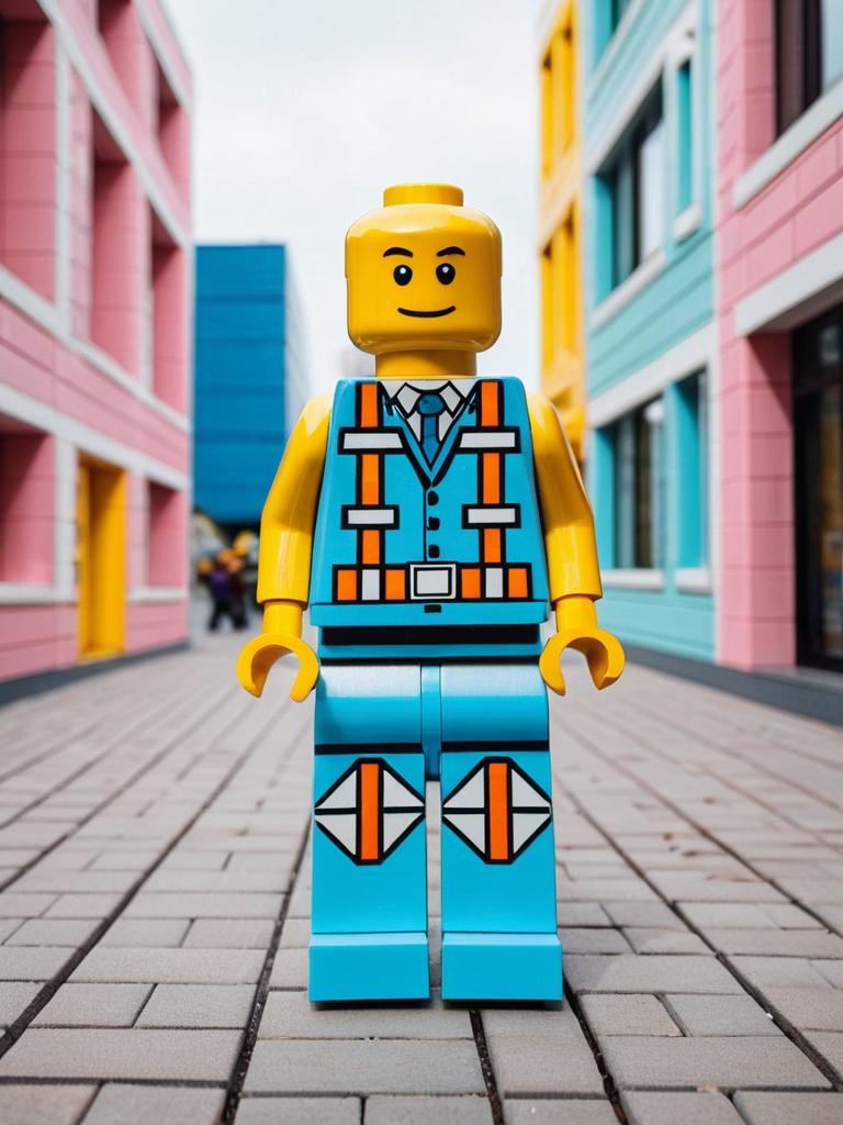 Photorealistic image of a person wearing a Lego construction worker costume standing on a paved street lined with pastel-colored buildings in shades of pink, blue, and yellow. The costume features a yellow Lego head and hands with a blue and orange safety vest and matching pants.