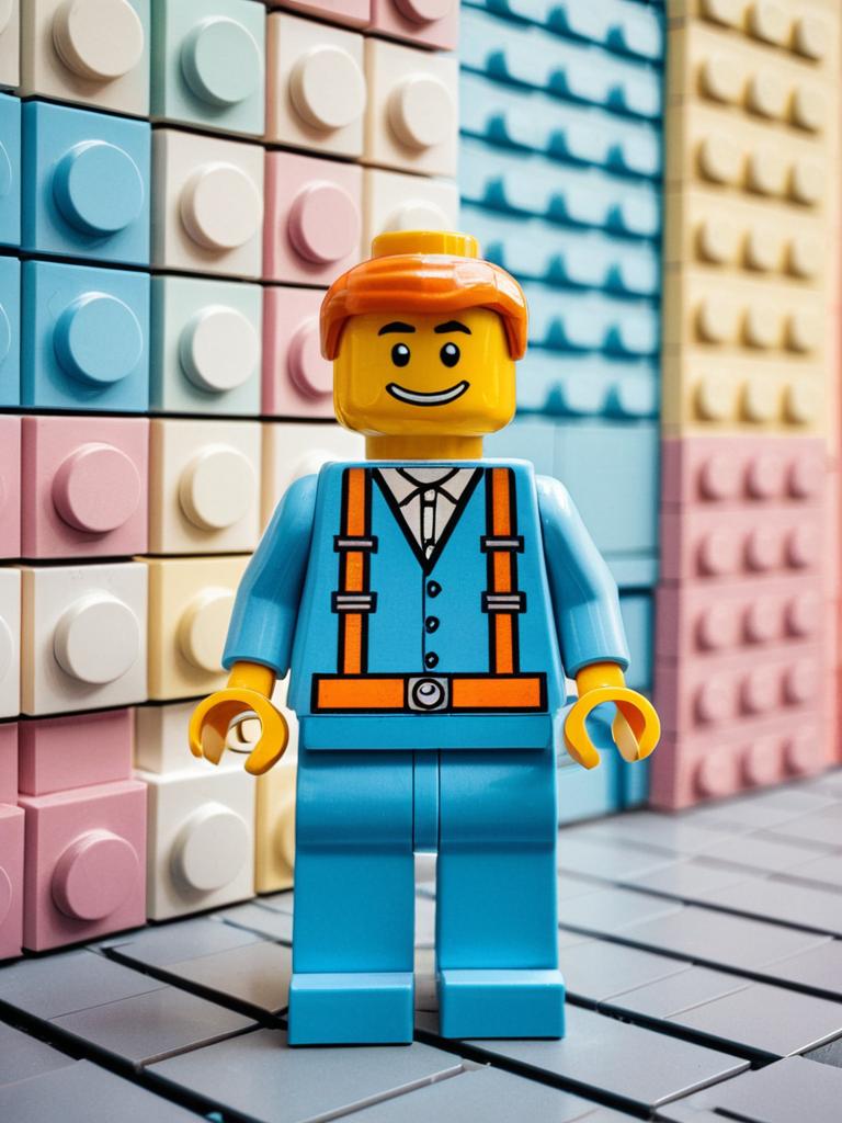 Man in Lego Pastel Building Blocks costume, photorealistic cosplay photography