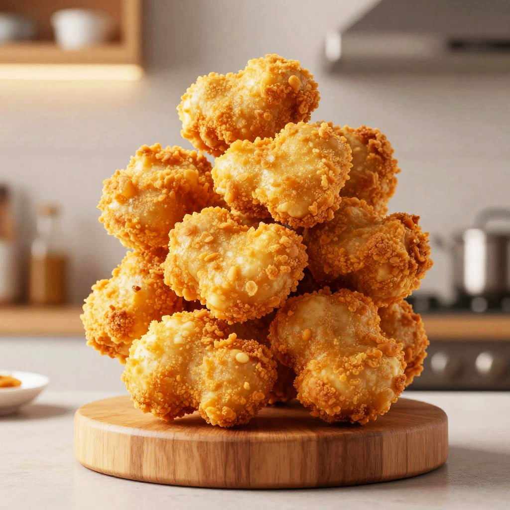 Chicken nugget trophy displayed on a wooden pedestal, golden crispy texture, gleaming under soft spotlight, detailed close-up, modern kitchen background, high resolution
