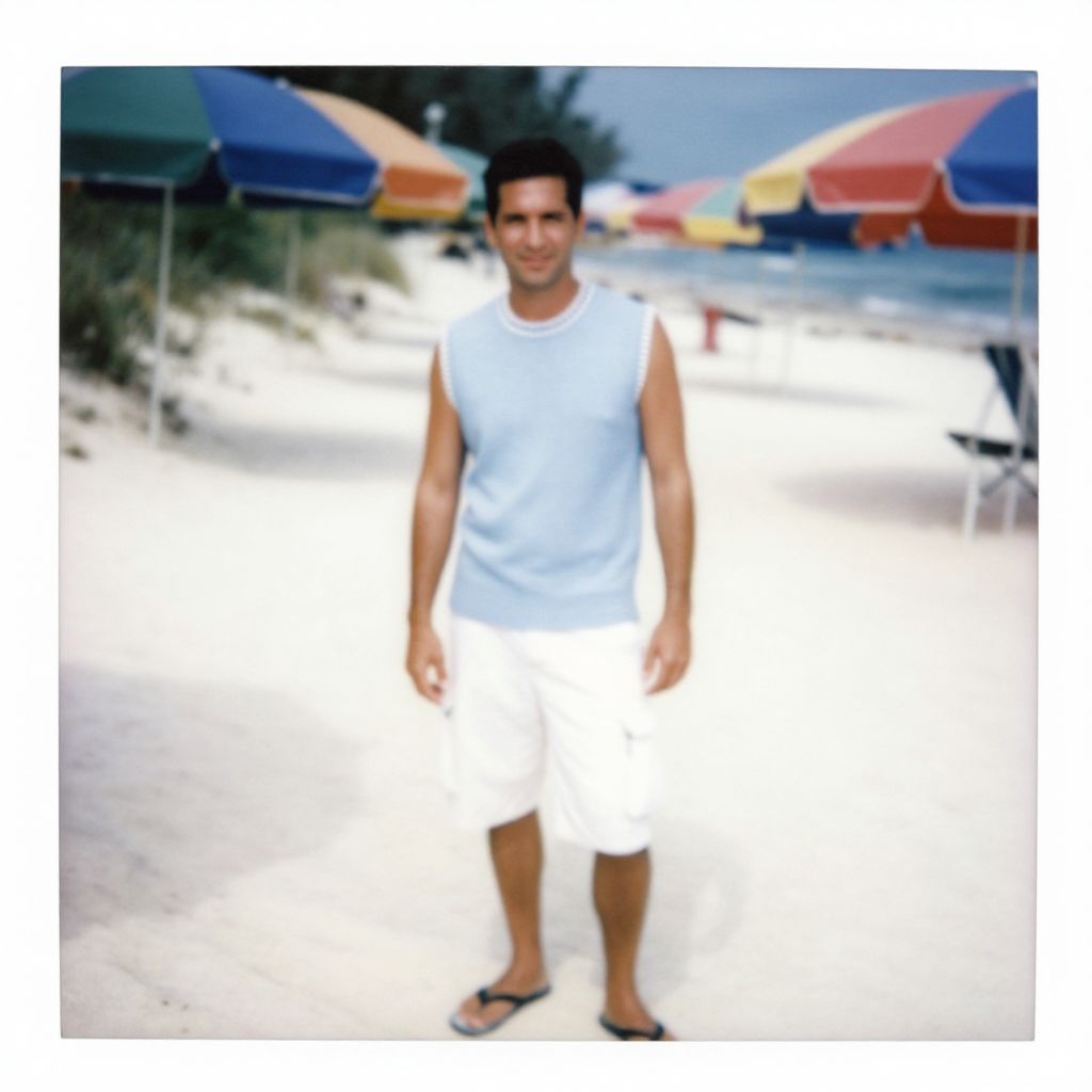 A man, light blue sleeveless sweater, white cargo shorts, casual flip-flops, standing in a secluded cove, soft white sand, colorful beach umbrellas, instant film style, relaxed smile, enjoying the sun. Man has masculine face and piercing eyes