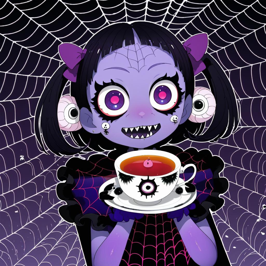 Muffet, undertale, 1girl, spider girl, monster girl, purple skin, fangs, extra eyes, short hair, black hair, two side up, hair bow, spider, teacup, spider web, by artist mura karuki, dark_illustrious