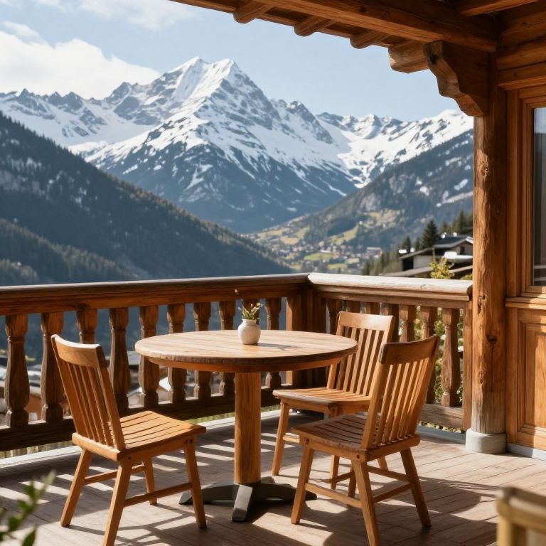 Serenity unfolds on this sun-drenched terrace, where the embrace of wooden warmth invites contemplation amidst the timeless majesty of snow-capped peaks and the gentle hum of alpine tranquility.