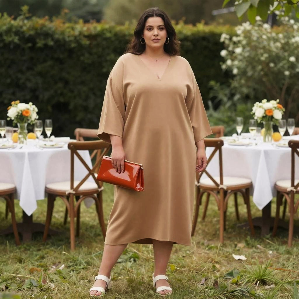 A Stocky woman, in a minimalist oversized camel tunic dress with a wide V-neck and three-quarter sleeves, paired with white open-toe sandals, holding a glossy burnt orange clutch, standing in a Champagne Morning Feast in a Private Garden, visual style of JC Staff. Sexy. Pretty face and beutiful eyes