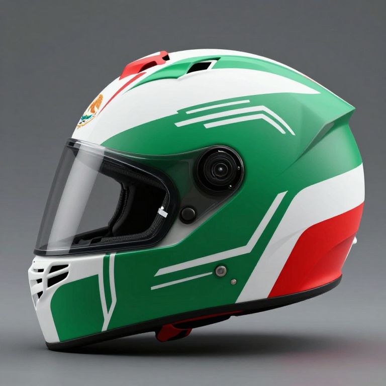 Crane abstract f1 helmet desgin, mexican culture, matte color, concept, lines, straight shapes, with green white and red colors, LEFT SIDE view,