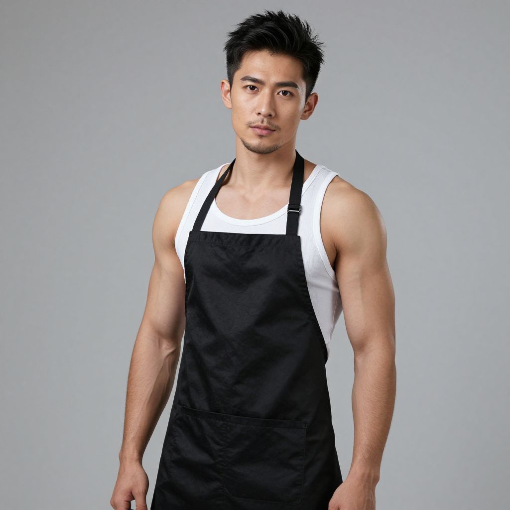 Photograph of an Asian man with short, spiky black hair and a muscular build standing against a plain gray background. He has a serious expression and is wearing a black tank top with white shoulder straps and a black apron over it. His arms are slightly bent at the elbows, showcasing his defined biceps and triceps. The image has a clean, minimalist style with a focus on the subject's physique and attire. The lighting is even, highlighting the contours of his muscles.