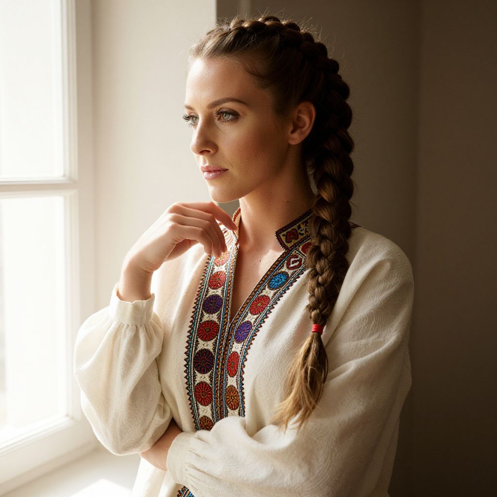 Photograph of a Caucasian woman with braided brown hair, wearing a white embroidered blouse, standing by a sunlit window, gazing thoughtfully.