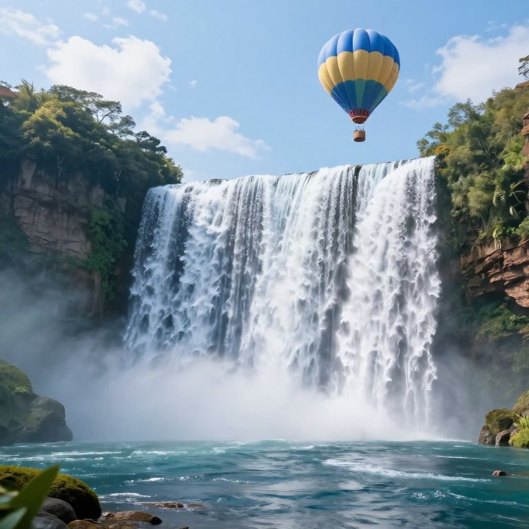 Photograph of a majestic waterfall with vibrant blue and yellow hot air balloon hovering above, surrounded by lush greenery and mist.