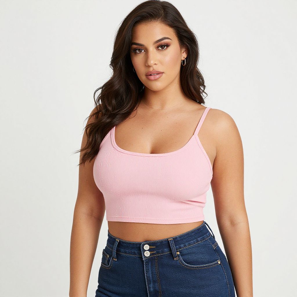 "Woman, casual chic, ribbed crop top in pale pink, scoop neckline, spaghetti straps, dark blue skinny jeans, mid-rise with button closure, plain white background.. Sexy. Pretty face and beаutiful eyes. Big breasts."