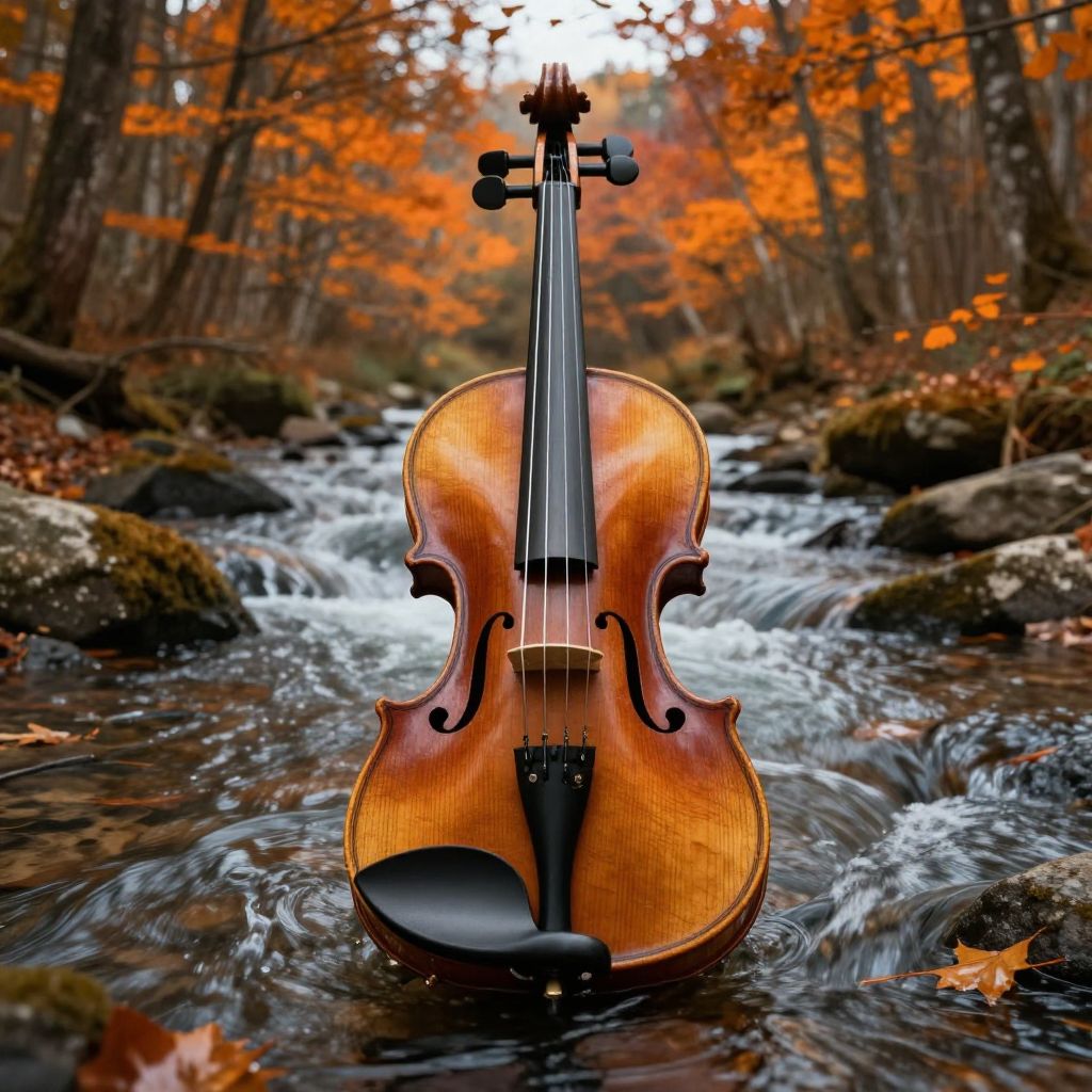 Photograph of a wooden violin with a rich, amber-brown finish, standing upright in the middle of a flowing, rocky stream. The violin's strings and f-holes are clearly visible. The background features a forest with tall trees adorned with vibrant orange and red autumn leaves. The stream's clear water creates ripples around the violin, reflecting light. The scene evokes a sense of serene beauty and natural harmony, with the warm colors of the violin contrasting against the cool, flowing water and the earthy tones of the forest.