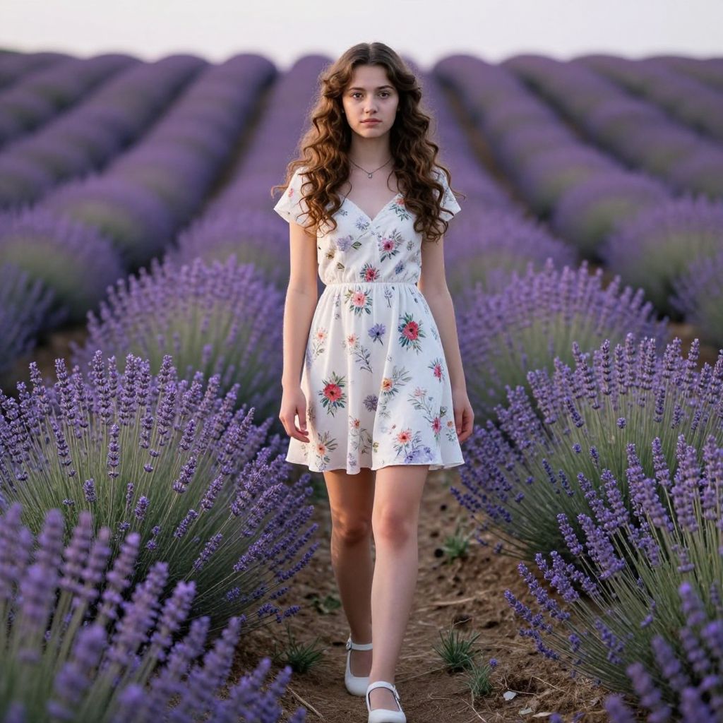 Photograph of a young woman with long, curly brown hair standing in a lavender field. She's wearing a white floral dress with short sleeves and white shoes. The lavender rows stretch into the background, creating a vibrant purple pathway. The woman has a fair complexion and a calm expression. The sky is clear and bright, suggesting it's either early morning or late afternoon.
