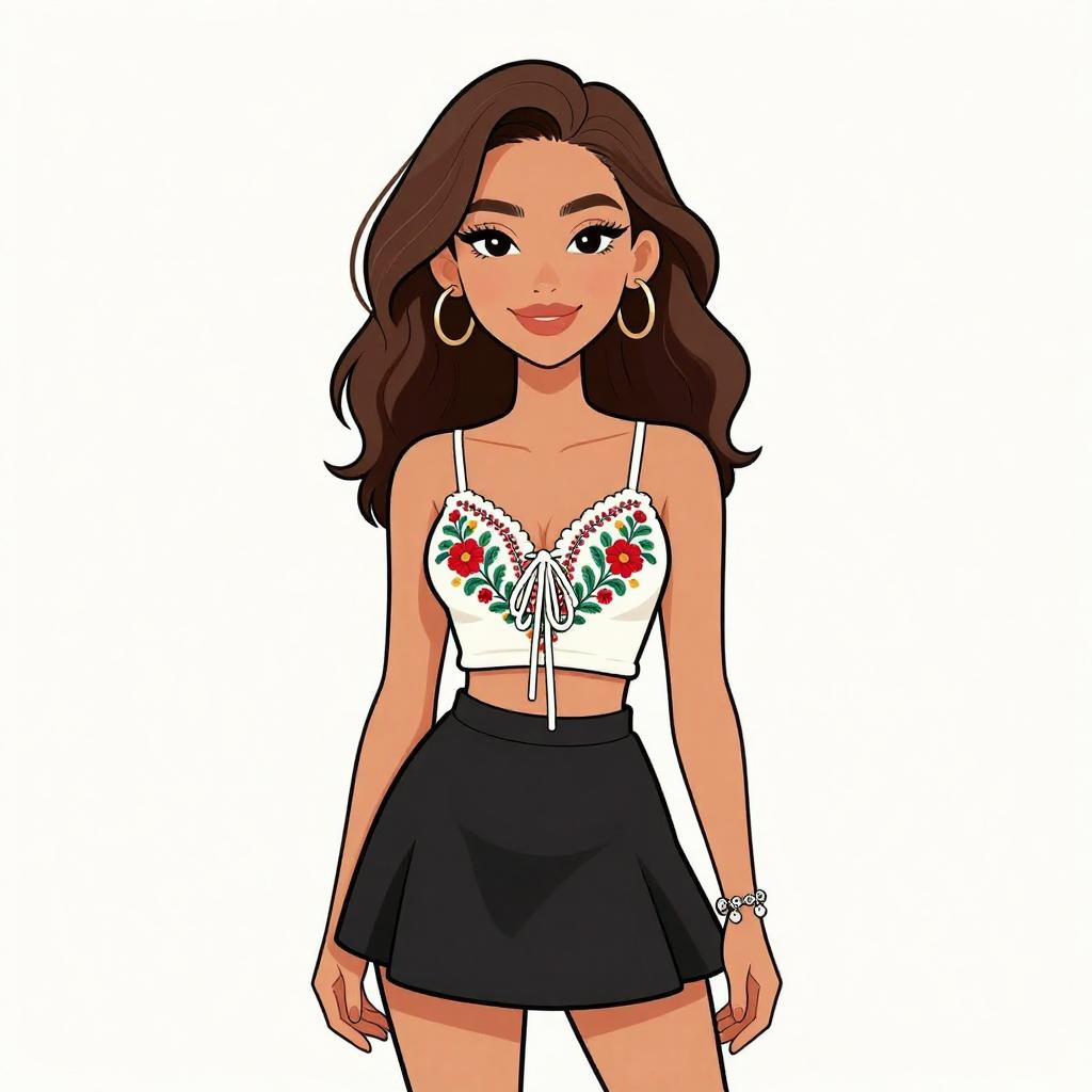 Woman with pretty face and pretty hair. smiling Woman, casual bohemian, white sleeveless tank top with lace detailing at the hem, scoop neckline, chambray denim shorts with a high waist, loose fit, simple gold bangle on one wrist, plain white studio background. --sref 1467