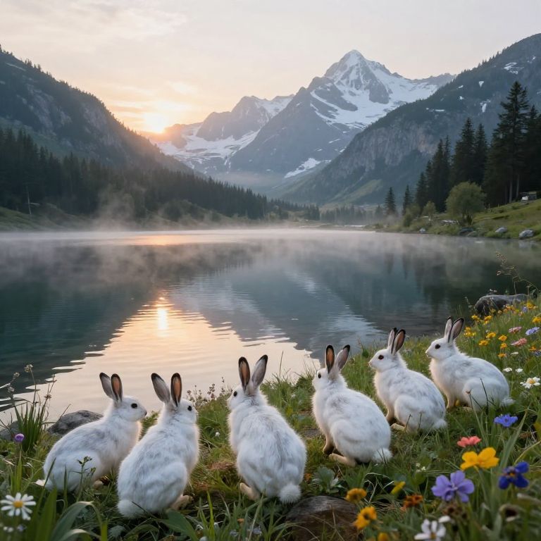 A group of white harengon adventurers resting by a crystal-clear mountain lake at dawn, reflections shimmering on the water, soft mist rising, peaceful and serene mood, detailed natural environment with wildflowers and distant snowy peaks, high fantasy art style.