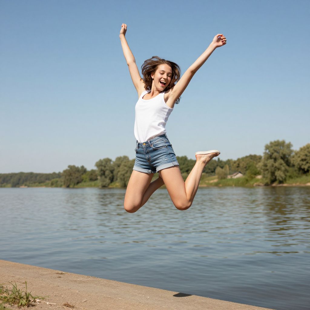 Photograph of a young woman with light brown skin and shoulder-length dark brown hair, jumping joyfully with arms raised and a wide smile. She wears a white sleeveless top and blue denim shorts. The background features a calm lake with a clear blue sky, surrounded by green trees and a distant shoreline. She is mid-air, her right leg bent and left leg extended, above a concrete edge. Sunlight highlights her joyful expression and dynamic pose. The image exudes a sense of freedom and happiness in a natural outdoor setting.