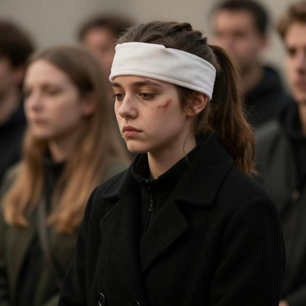 Photograph of a young woman with light skin and brown hair in a ponytail, wearing a black coat. She has a white bandage on her forehead, minor cuts on her face, and a lip piercing. Background has a blurred woman with blonde hair and indistinct faces. She looks somber, eyes downcast. Warm lighting. Blurred crowd in the background.