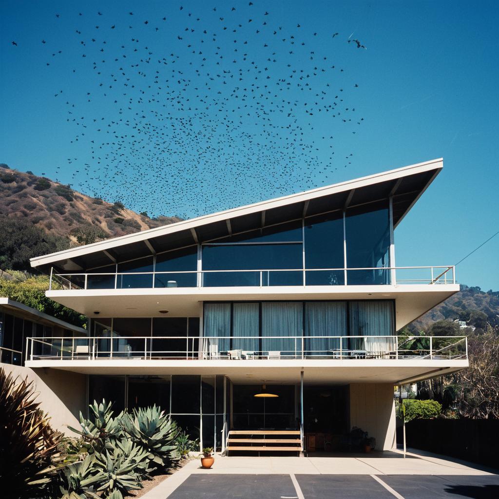 Two-story mid-century modern residential home inspired by Charles and Ray Eames, featuring steel, solar glass, and polished concrete. Corner windows and lanterns under the slanted roof. Located on the edge of the Santa Monica Mountains with a clear blue sky and a large murmuration of starlings overhead.