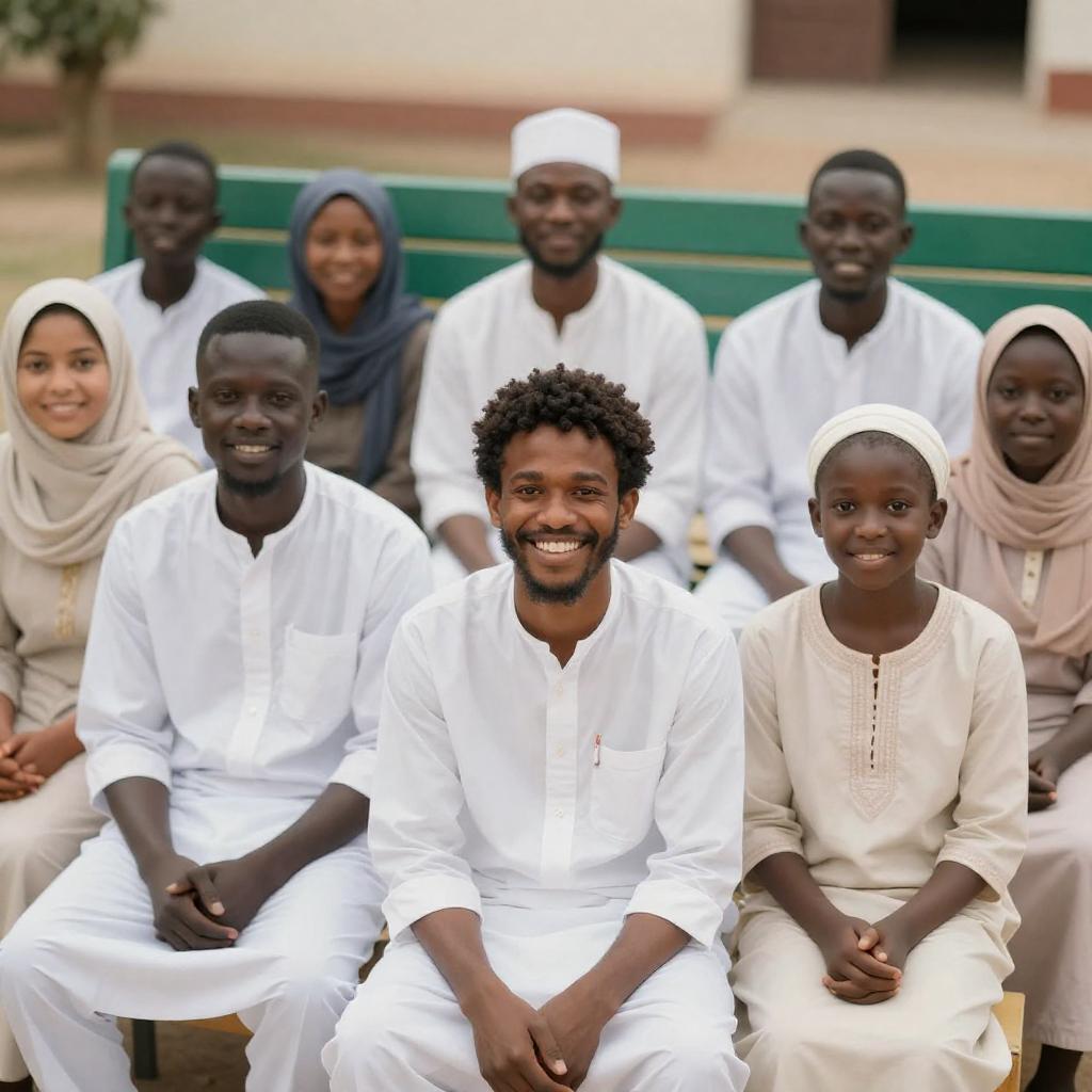 Photograph of a diverse group of nine people, including men, women, and a child, seated outdoors. They wear white and light-colored clothing, with some in traditional attire. The central man with curly black hair smiles broadly. The background shows a green bench and blurred outdoor setting. The group appears happy and relaxed.