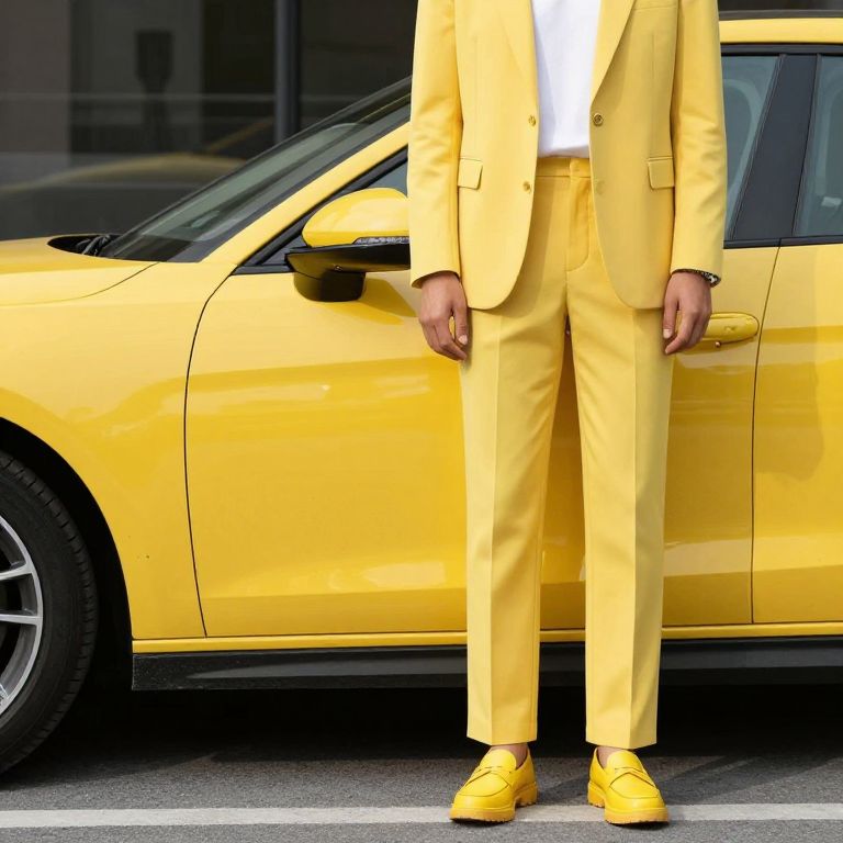 Yellow Car, yellow suit and yellow shoes standing next to a yellow car