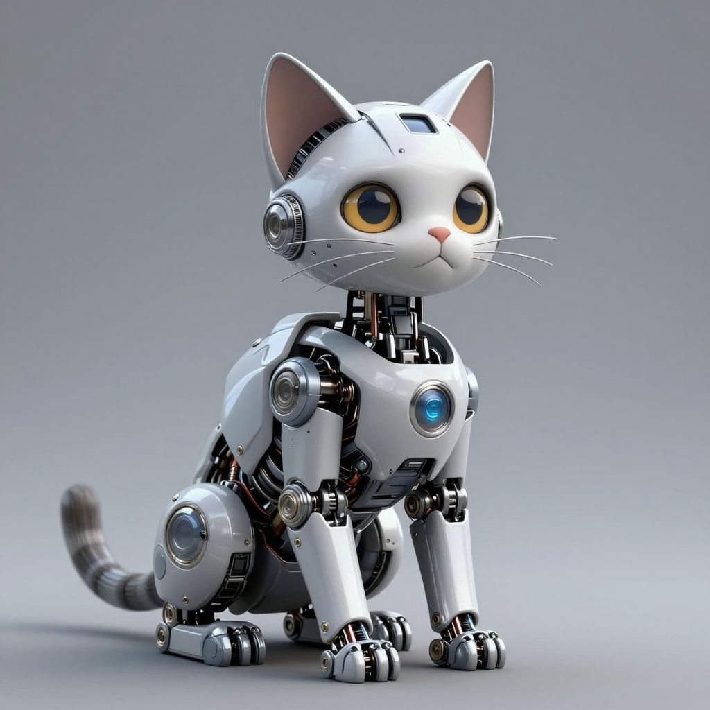 Digital CGI image of a cute, white, robotic cat with large yellow eyes, blue gem eyes, and metallic joints, sitting against a gradient gray background