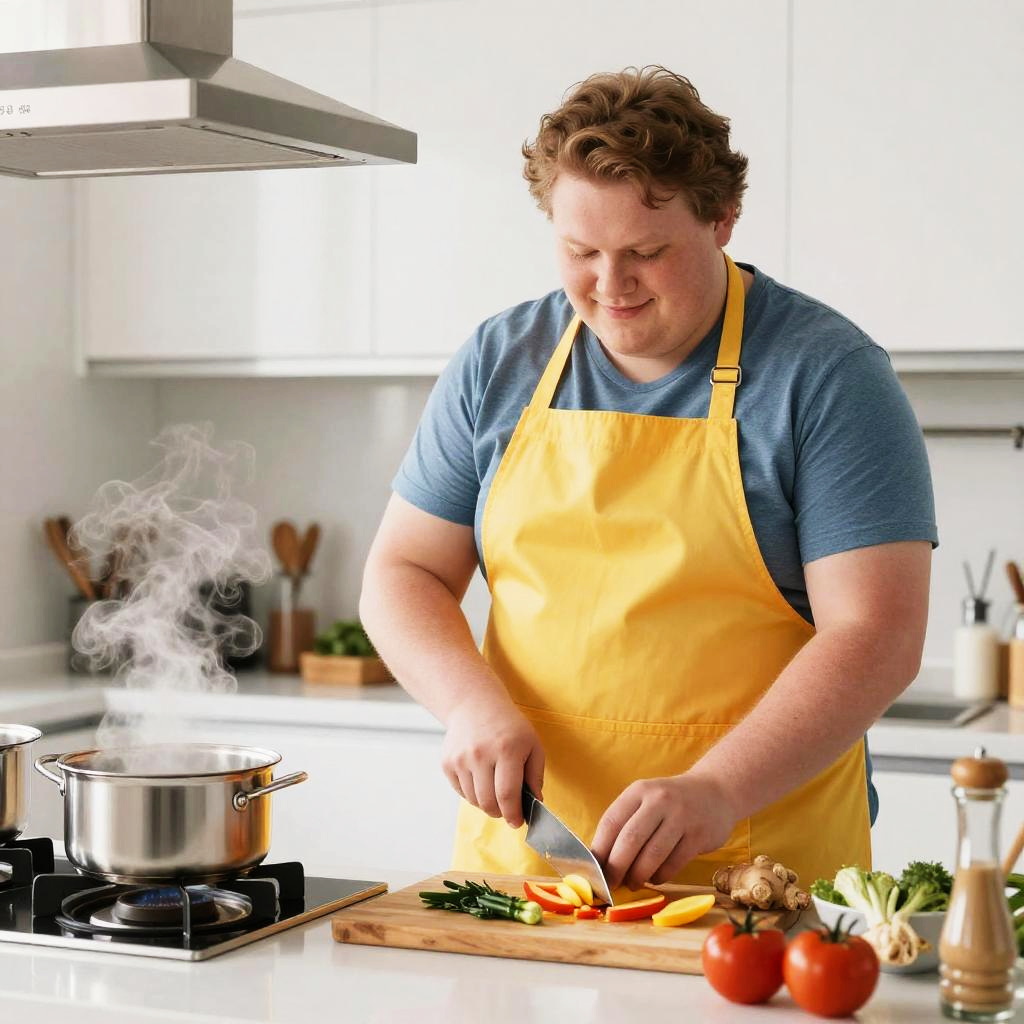 Fat ginger guy cooking in a modern kitchen, chopping vegetables, steam rising from pots, wearing a colorful apron, cheerful atmosphere, bright and clean environment, highly detailed and realistic