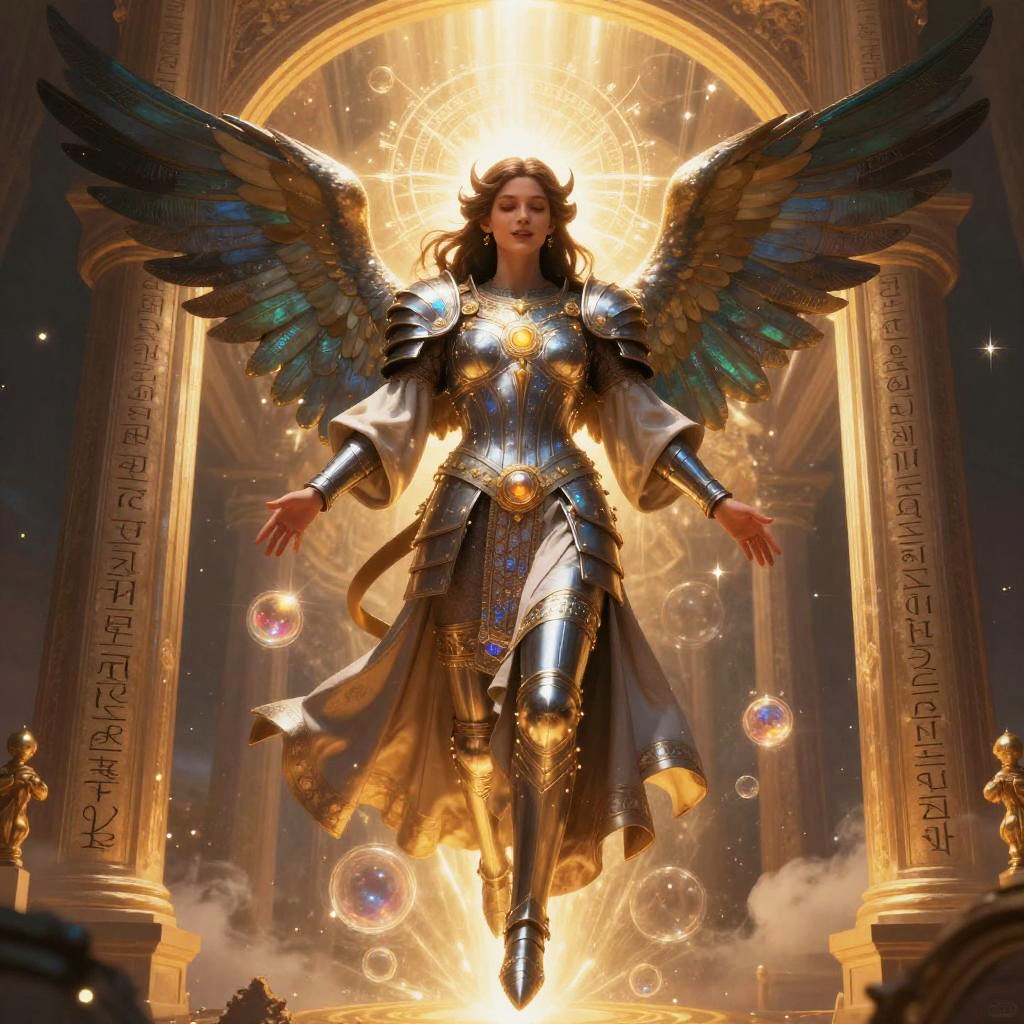 Malakh portrayed as a guardian angel descending from a radiant portal, vibrant colors illuminating the scene, intricate armor with celestial motifs, surrounded by protective light orbs and ancient script, emotional and hopeful mood.