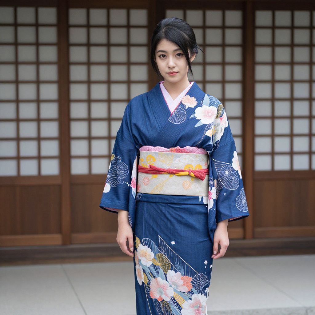 Photograph of a young Japanese woman with black hair in a navy blue floral kimono, white inner robe, and orange-yellow obi, standing in