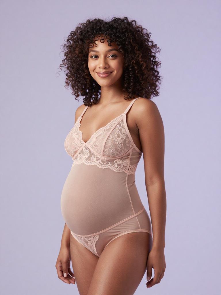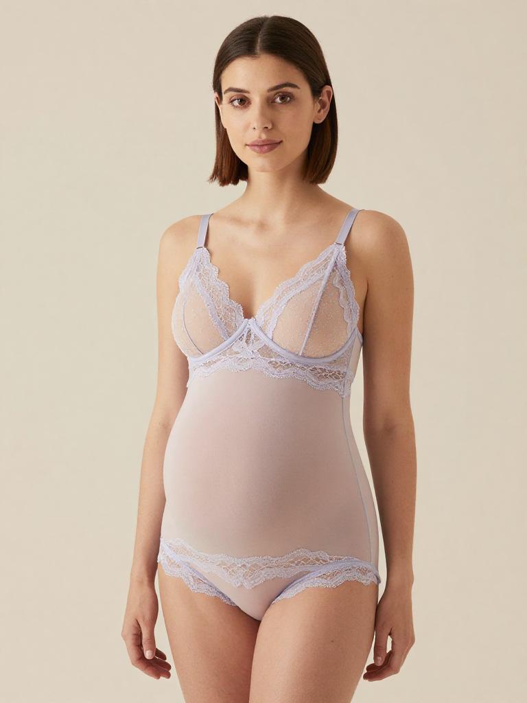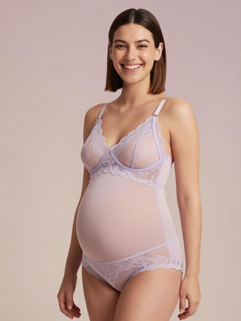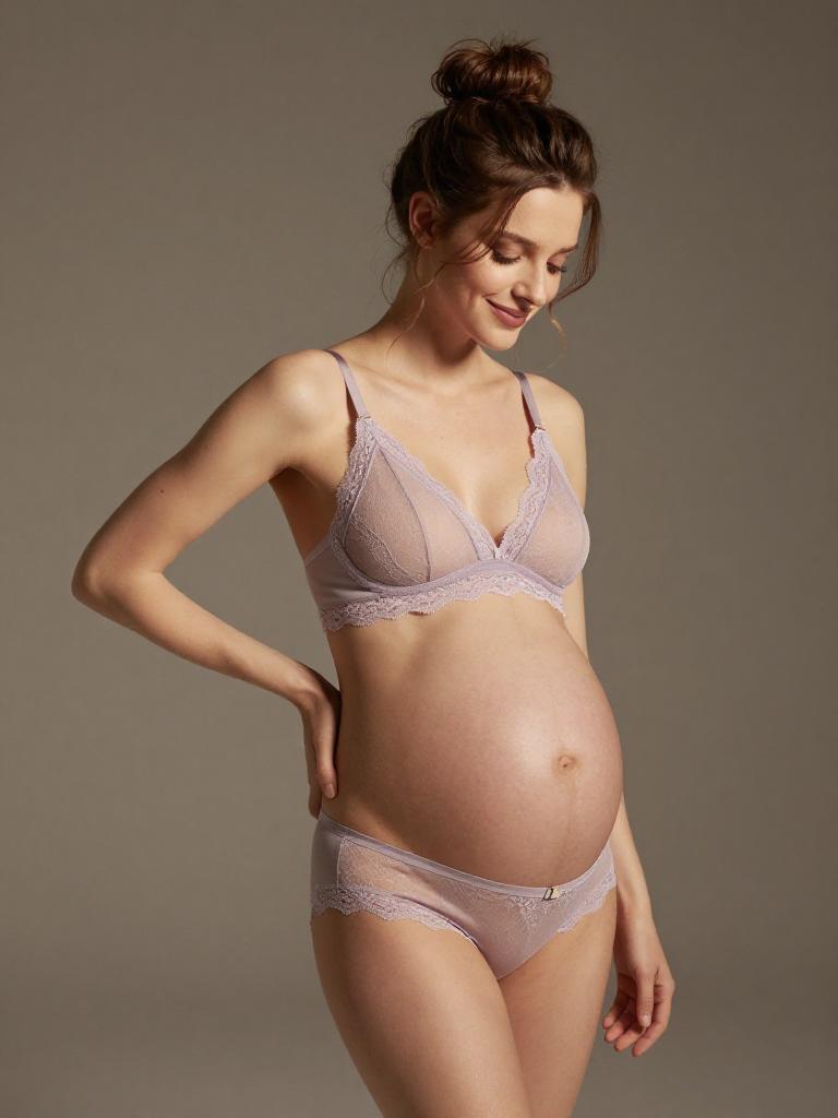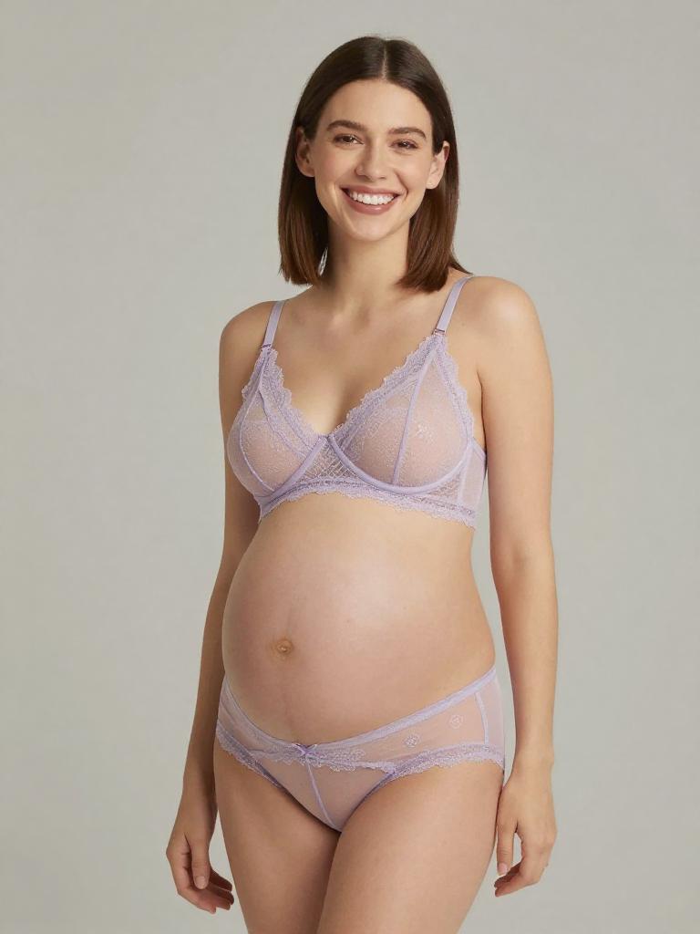 Pregnant fashion outfit, image in the style of painterly soft-focus portrait style of joyful expecting woman laughing softly with straight mid-length hair with a center part and curvy figure with a full round baby bump, lingerie mesh set, wearing pastel lilac mesh bra with delicate lace edges and matching panties, standing in soft light grey seamless backdrop studio background, tasteful high-end maternity lingerie fashion photography, soft flattering lighting, subtle skin retouching, high resolution, ultra-detailed