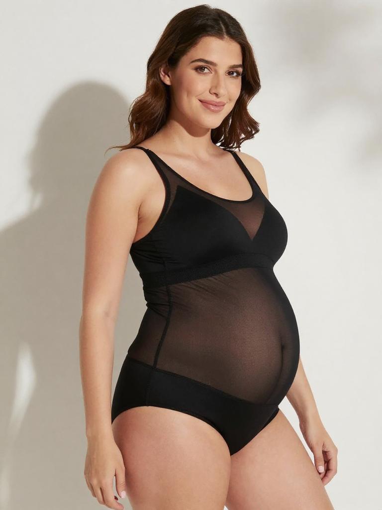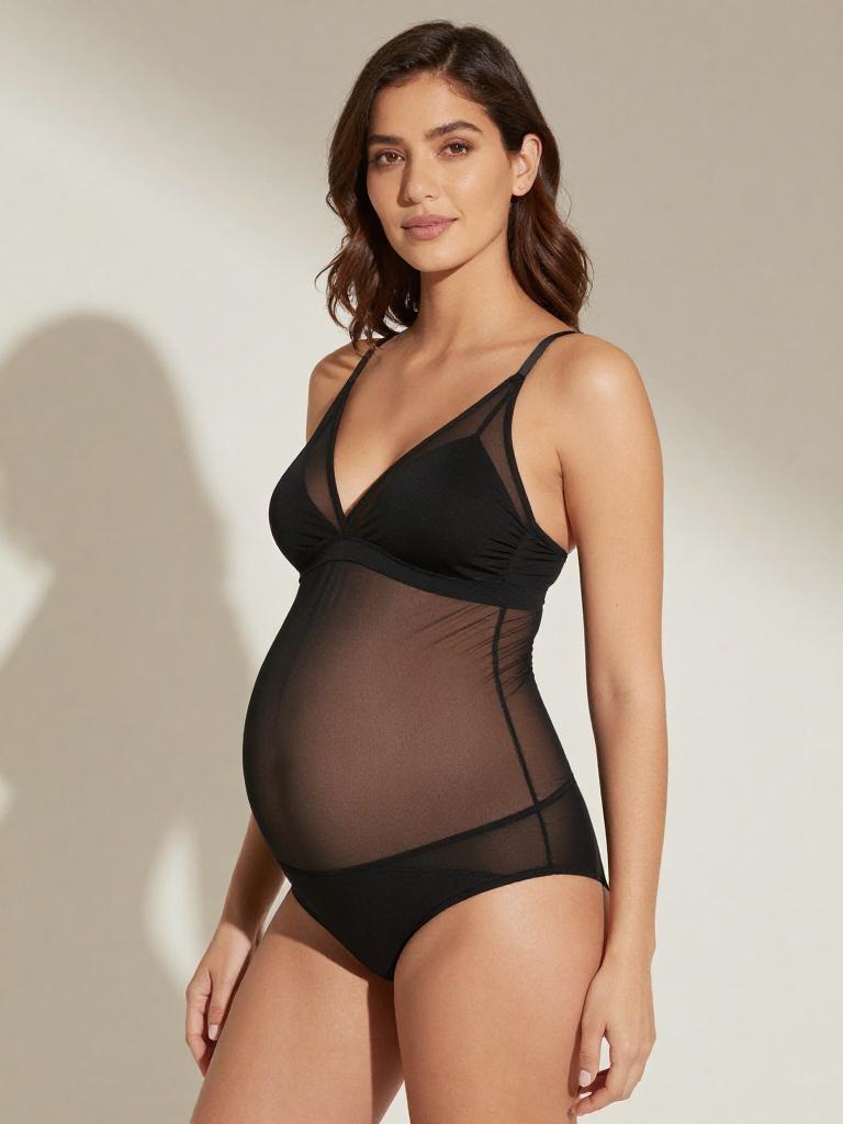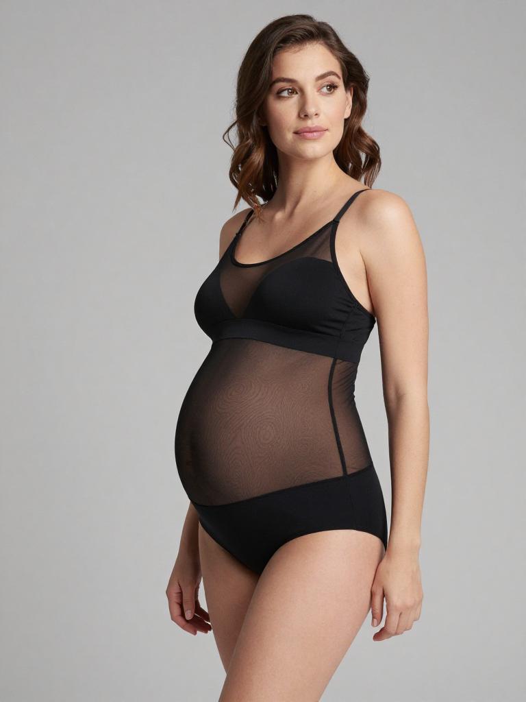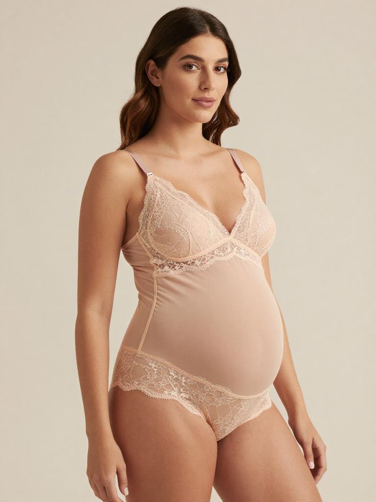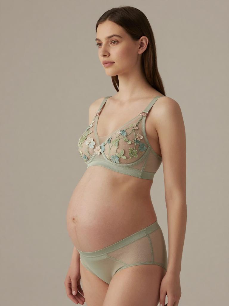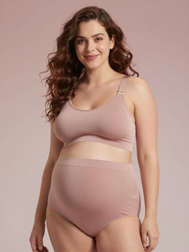 Pregnant fashion outfit, image in the style of painterly soft-focus portrait style of joyful expecting woman laughing softly with straight mid-length hair with a center part and curvy figure with a full round baby bump, lingerie mesh set, wearing pastel lilac mesh bra with delicate lace edges and matching panties, standing in soft light grey seamless backdrop studio background, tasteful high-end maternity lingerie fashion photography, soft flattering lighting, subtle skin retouching, high resolution, ultra-detailed
