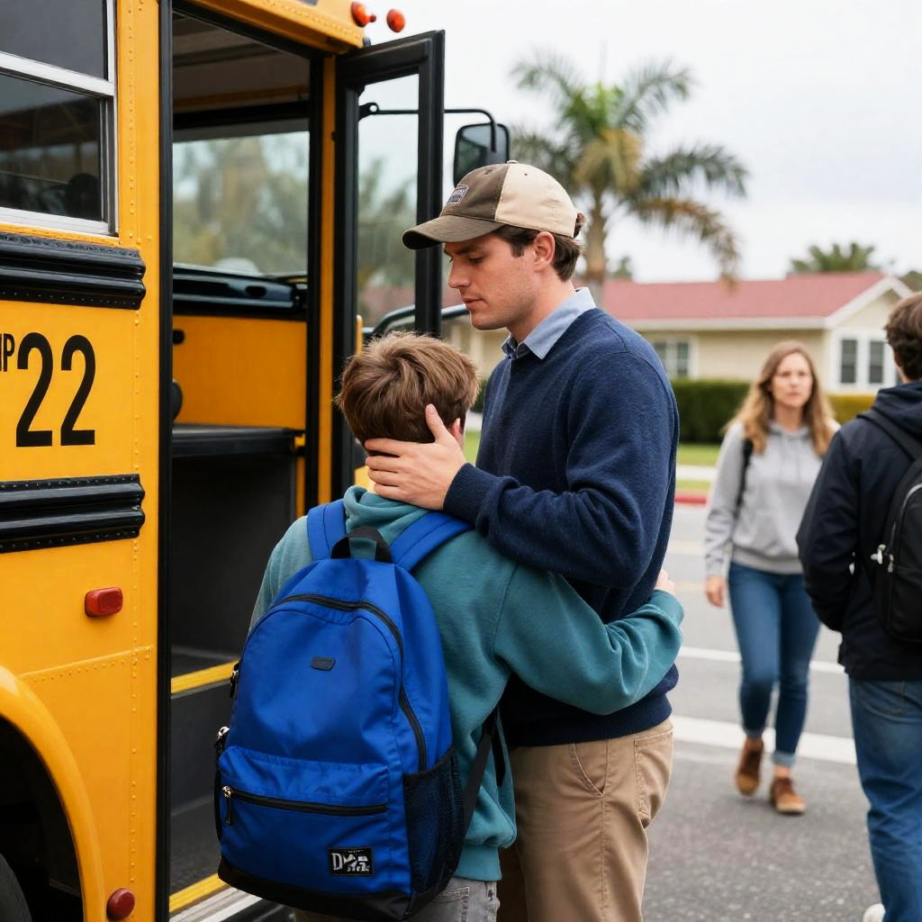 Photograph of two men inside a bus. Young boy with dark hair, baseball cap, and uniform smiles at older man with dark hair, tan uniform, and black tie. Boy points with right hand. Sunlight through bus windows. Boy on left, man on right.
