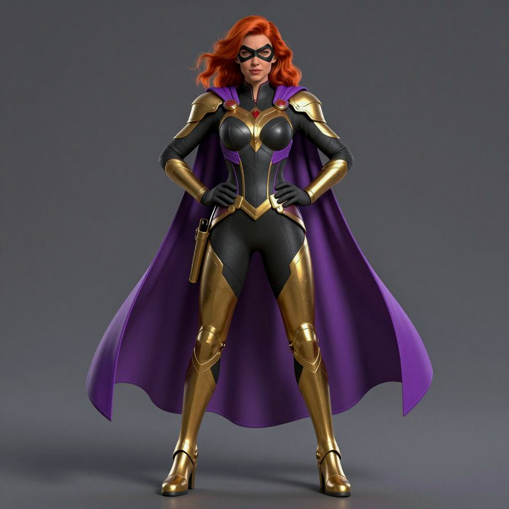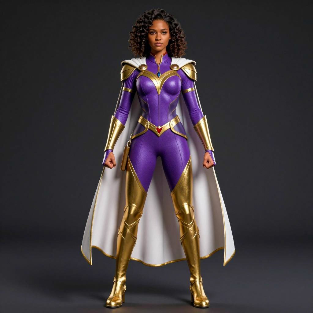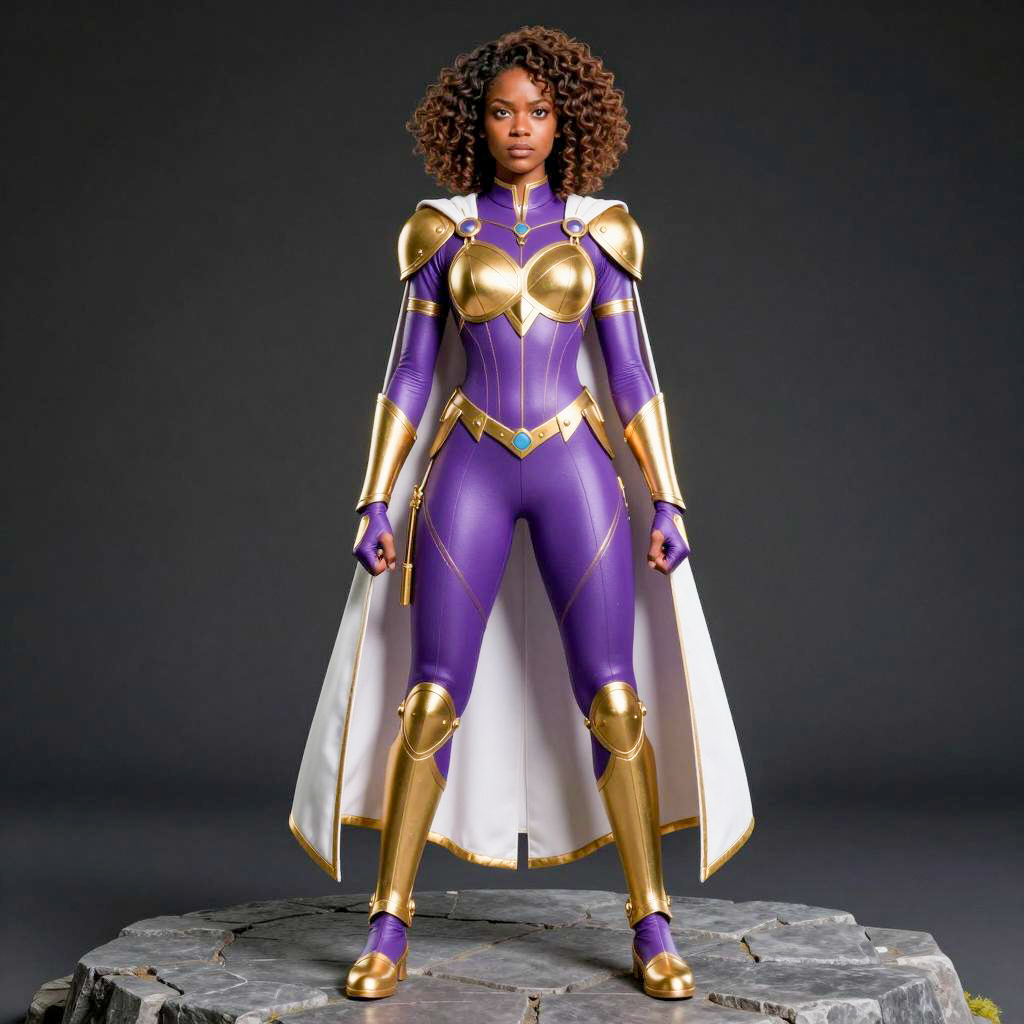 Fucking statue of a strong black woman with intense expression. She has dark skin, large grey afro hair, and wears a tight black bodysuit with gold accents. Her bodysuit has angular patterns and her breasts are medium-sized. She has gold bracelets on her arms and a long black cape with gold trim that flows behind her. She stands with hands on hips. The base is round and has gold designs. She looks confident and powerful. The background is solid black. The statue is highly detailed and realistic.