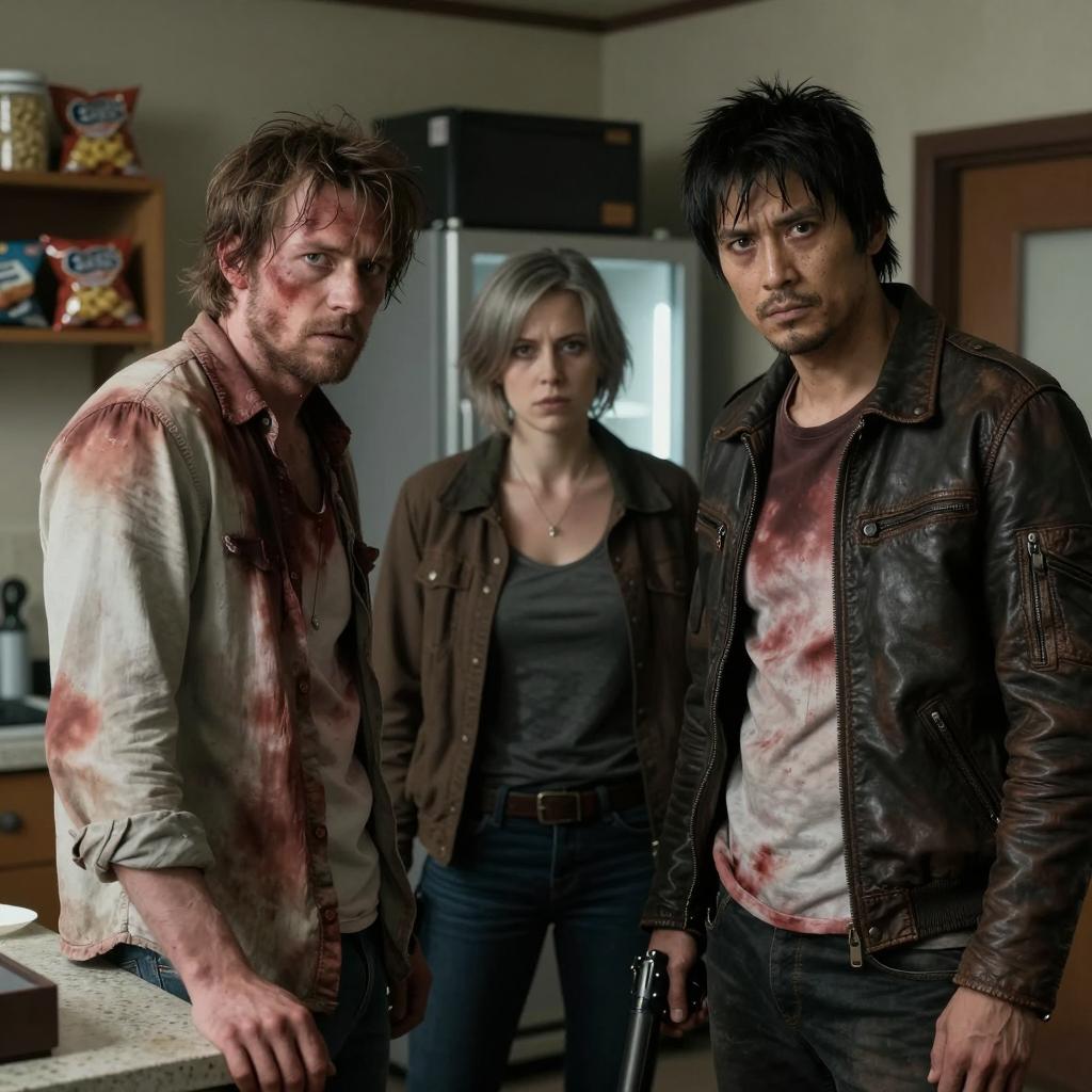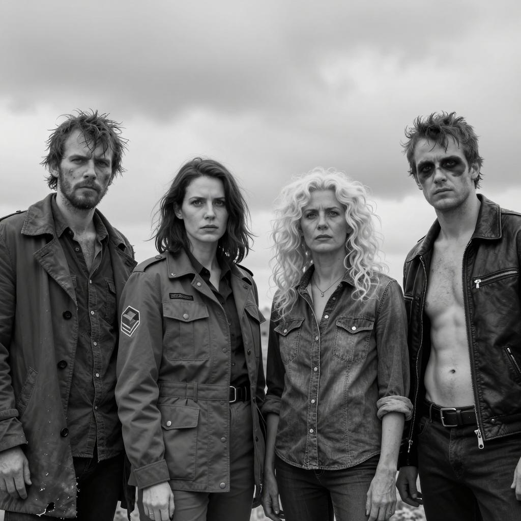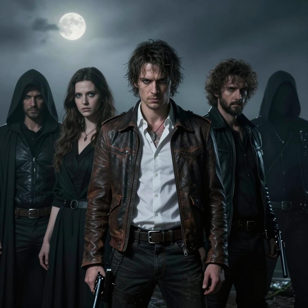Photograph of four individuals in a dark, misty setting. Central figure with messy hair, leather jacket, white shirt, and gun in right hand. Left figure in hooded robe, right figure with curly hair and gun, fourth figure in dark silhouette. All intense expressions. Background foggy, moonlit.
