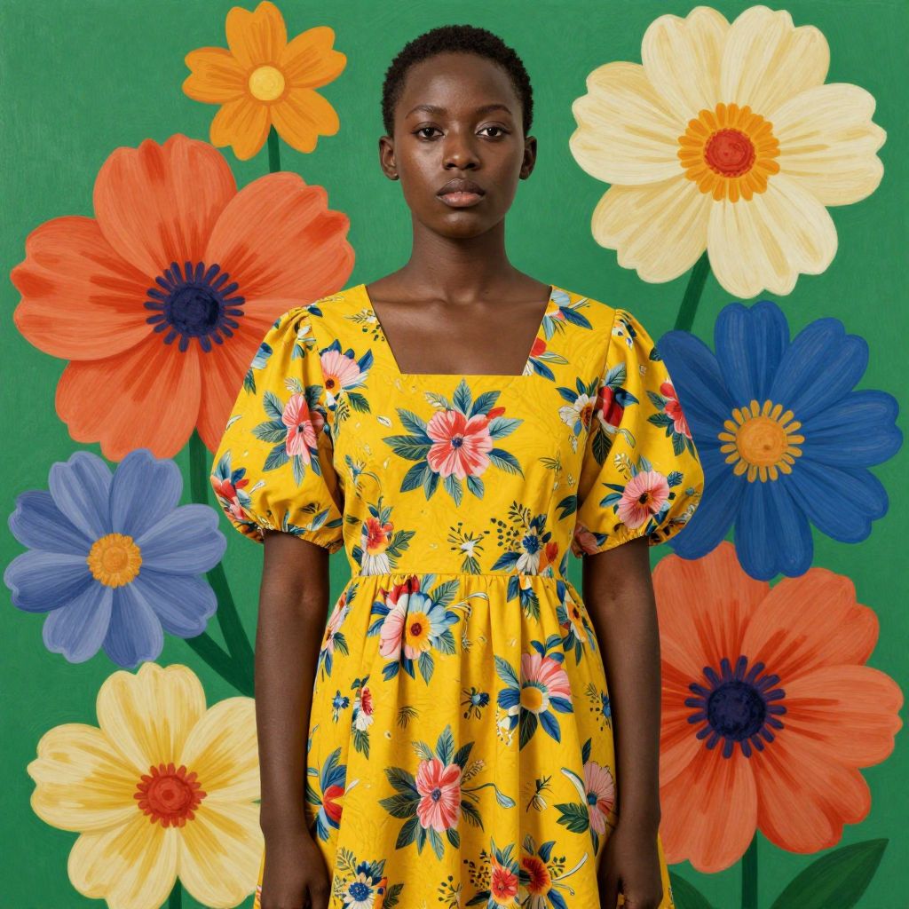 A vibrant digital artwork inspired by Kehinde Wiley's style, featuring a woman in a floral-patterned yellow dress against a bold, green background adorned with large, colorful flowers, showcasing a blend of realism and artistic flair with high-definition detail.