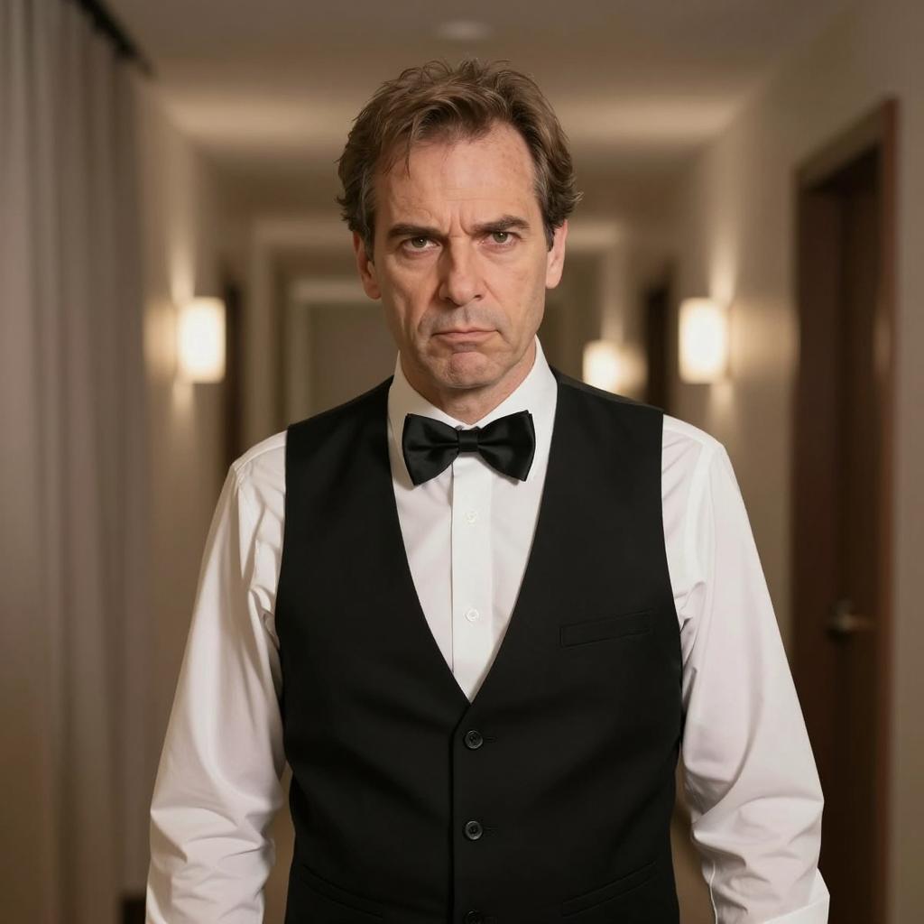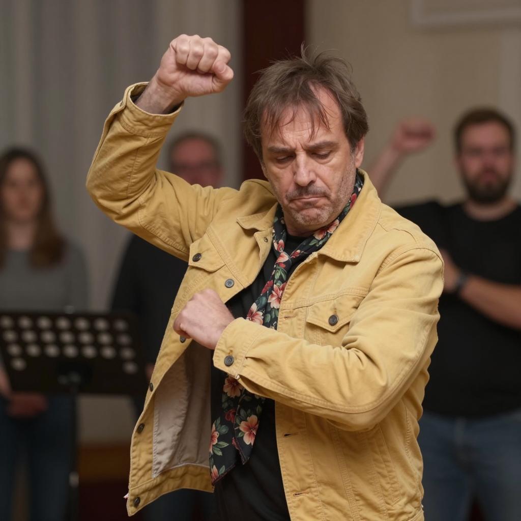 Middle-aged man with short brown hair, wearing a yellow jacket and floral scarf, raises his right fist in a dancing pose. Background includes blurred people, music stand, and dimly lit room. Intense facial expression. Motion blur.