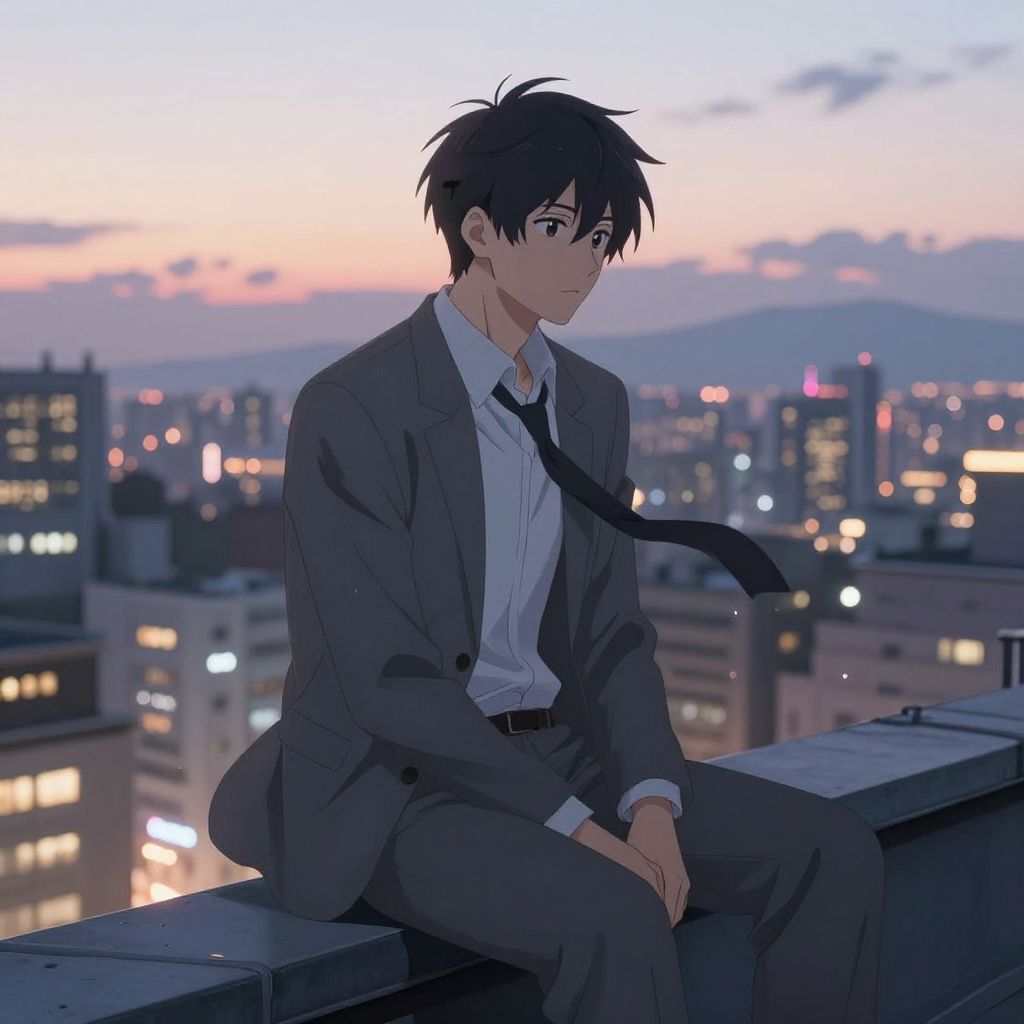 Anime style guy in gray suit sitting on rooftop overlooking city skyline at dusk, contemplative expression, loose tie flapping in the wind, subtle anime glow effects, soft fading sunlight mixed with city lights, detailed background showing distant buildings