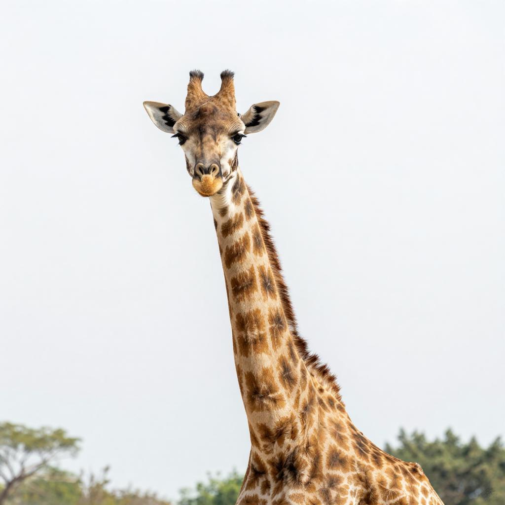 Photograph of a tall giraffe with a long neck, brown and white patterned coat, and small horns, standing against a bright white sky with