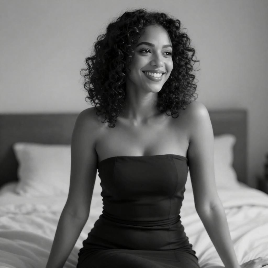 Black-and-white photograph of a smiling woman with curly hair, wearing a strapless black dress, sitting on a bed with a striped blanket. She has a light skin tone and is looking slightly to the right. The background is softly blurred.
