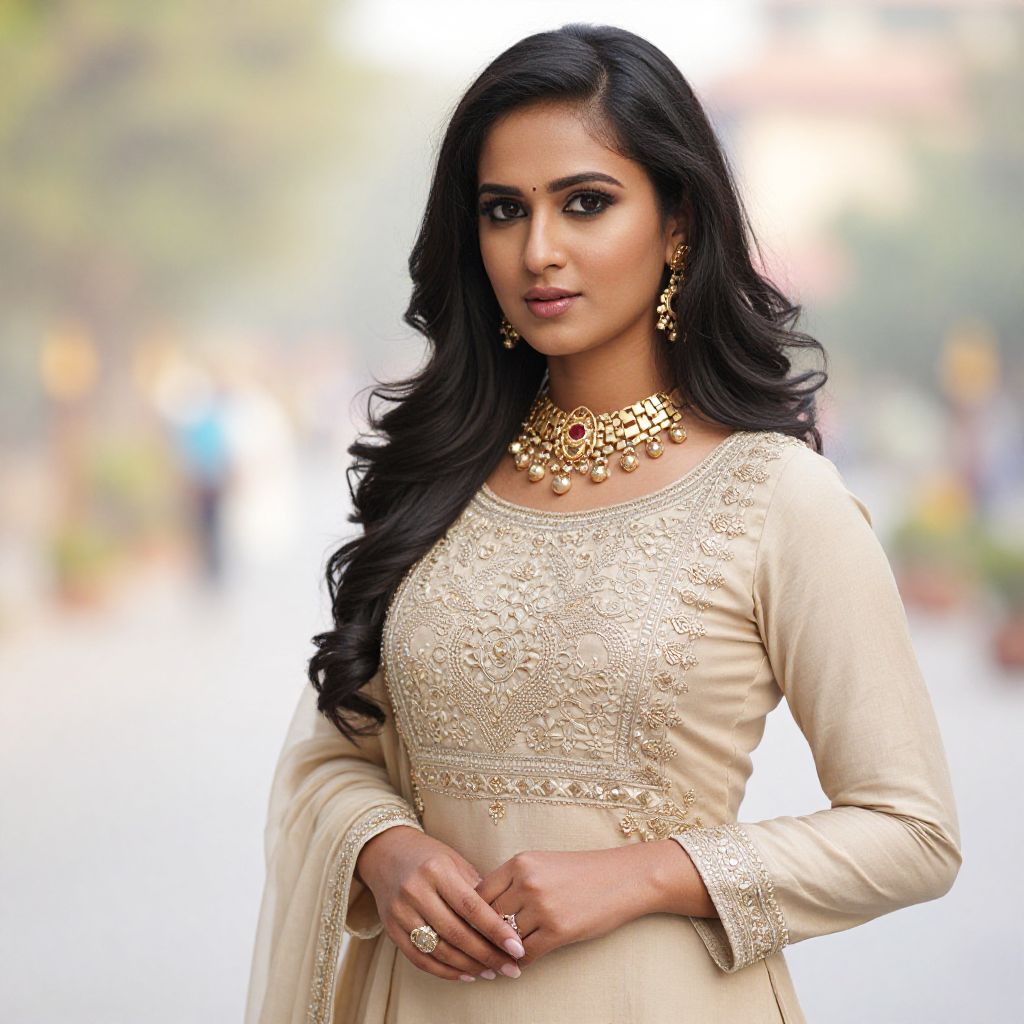 Grand salwar suit wedding, 1girl, solo, jewelry, long hair, necklace, blurry background, blurry, realistic, dress, black hair, photorealistic, looking at viewer, earrings, outdoors, ring