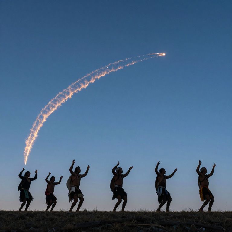 A tribe of wind-walkers dances across the sky, their feet leaving glowing trails that only disappear when sung to in an ancient dialect.