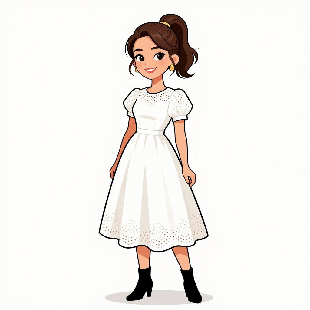 Digital illustration of a smiling young woman with brown hair in a ponytail, wearing a white dotted dress, black ankle boots, and small earrings, standing