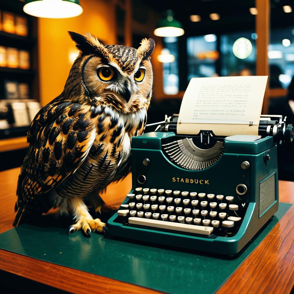 Hyper-realistic photo of an owl taking notes at Starbucks, in technicolor style. Photographic quality with cinematic lighting, shot on Eastman Kodak Colour Negative film 5251, 8k resolution, ultra-detailed and vibrant.