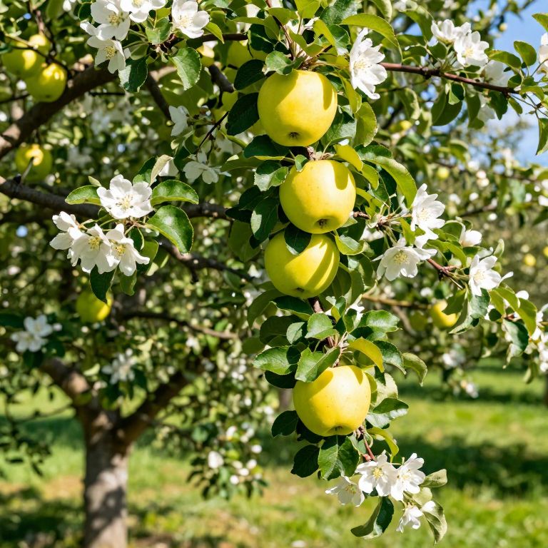 Close-up of a Costard apple tree branch laden with ripe yellow apples and white blossoms. The tree is situated in a serene orchard with lush green leaves, captured under bright spring sunlight. The vivid colors and sharp focus highlight the natural beauty and details of the apples and flowers.