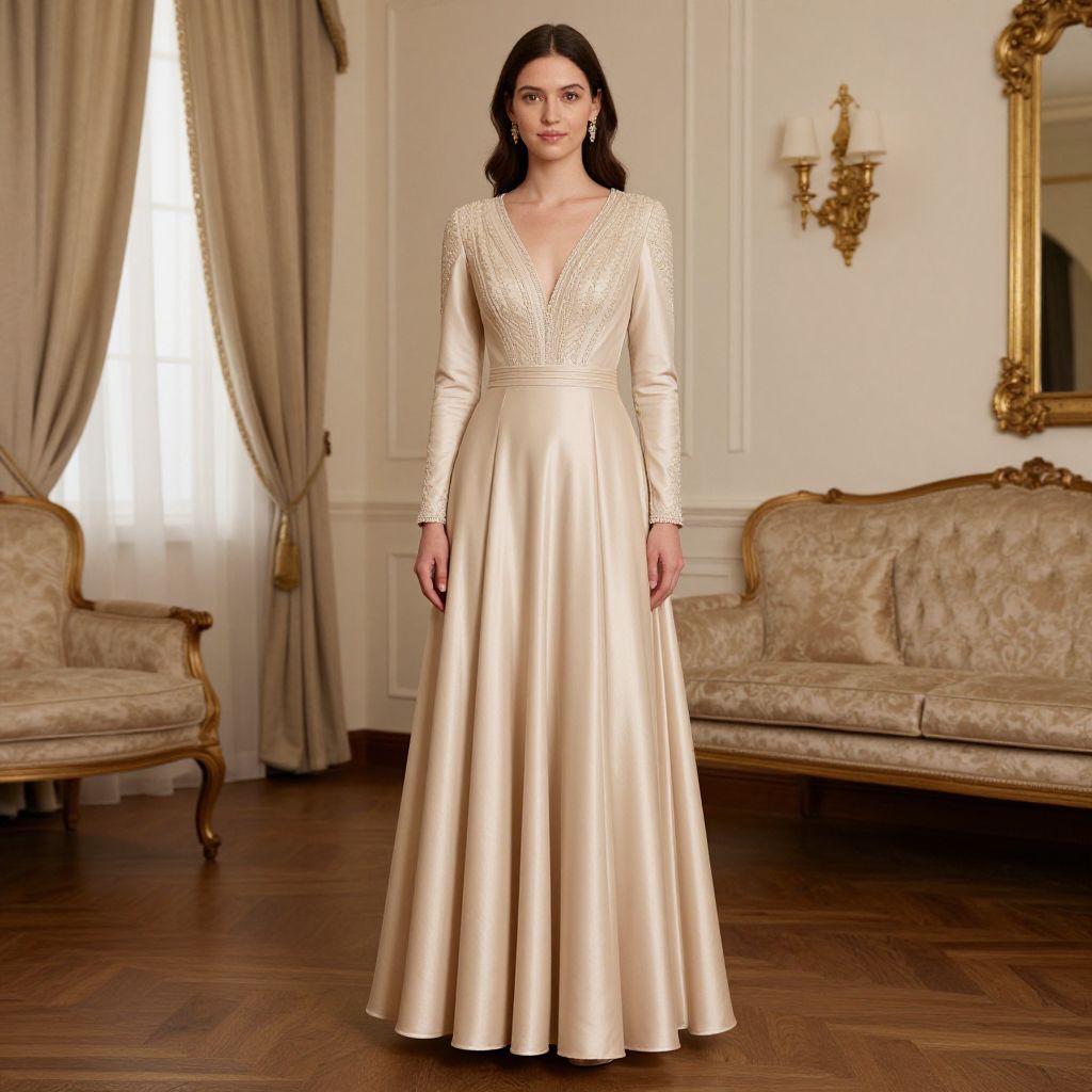 Photograph of a woman with dark hair wearing an ivory, long-sleeved, V-neck, lace-embellished satin gown, standing in