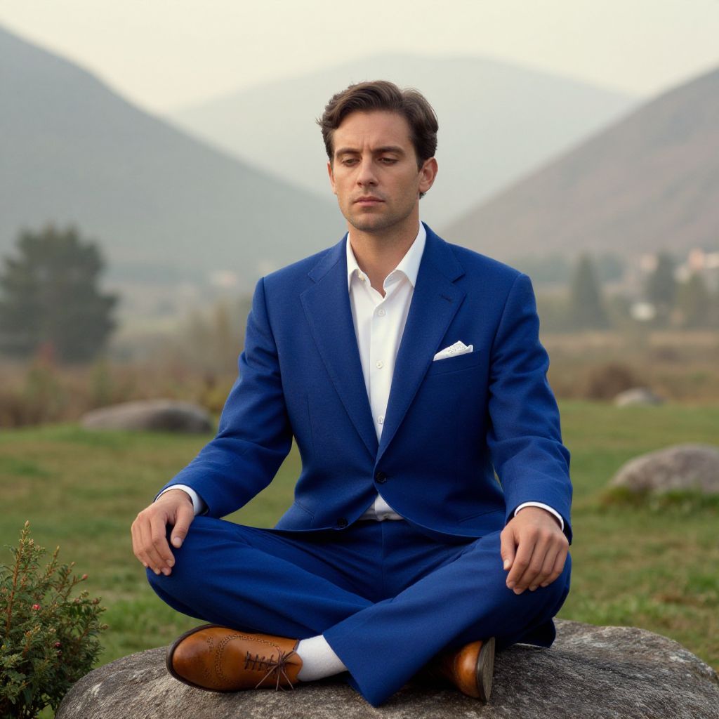 Photograph of a young Caucasian man with short brown hair, sitting cross-legged on a large rock in a grassy, mountainous landscape. He wears a sharp, royal blue suit with a white dress shirt, brown leather shoes, and a white pocket square. His expression is calm and contemplative. The background features blurred mountains and greenery, with a cloudy sky. His hands rest on his knees, and the rock has a rough texture. The overall style is modern and professional, with a focus on the man's poised and relaxed demeanor.