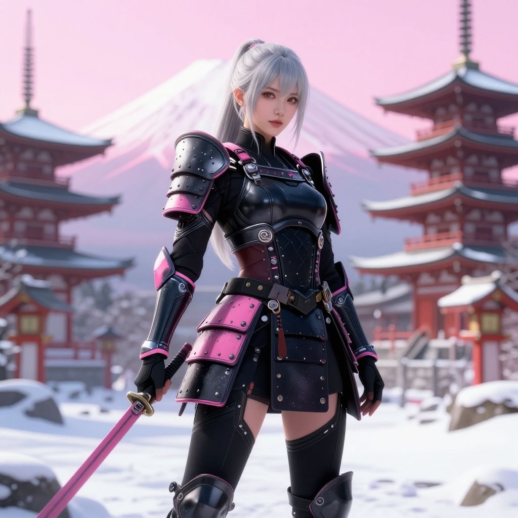 A digital illustration of a futuristic female samurai warrior dressed in black and pink armor, standing confidently in a snowy Japanese setting. She has silver hair tied back and is surrounded by traditional Japanese pagodas with Mount Fuji in the background under a pink sky.