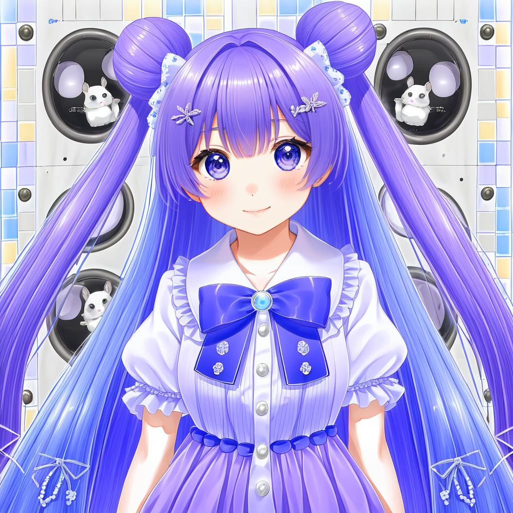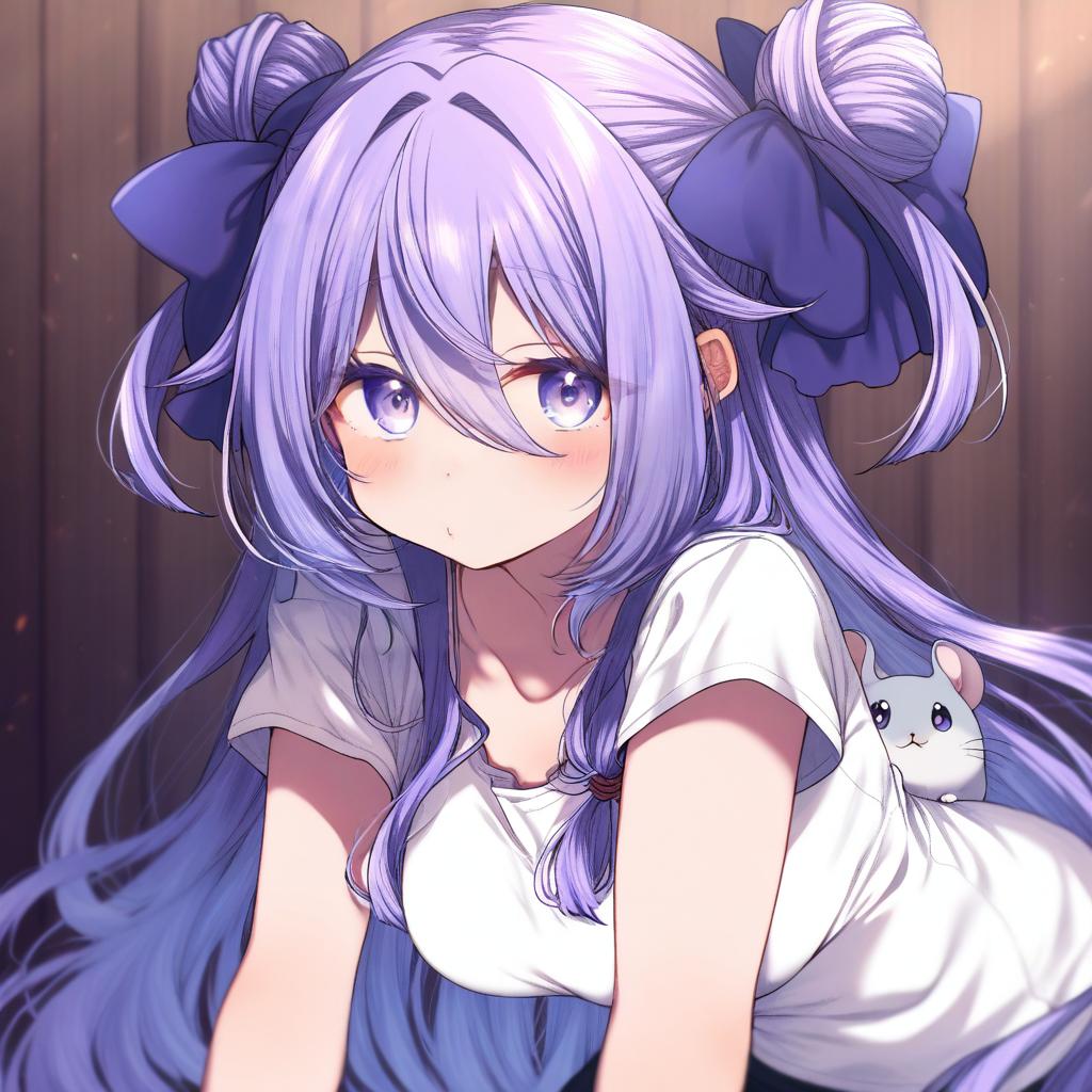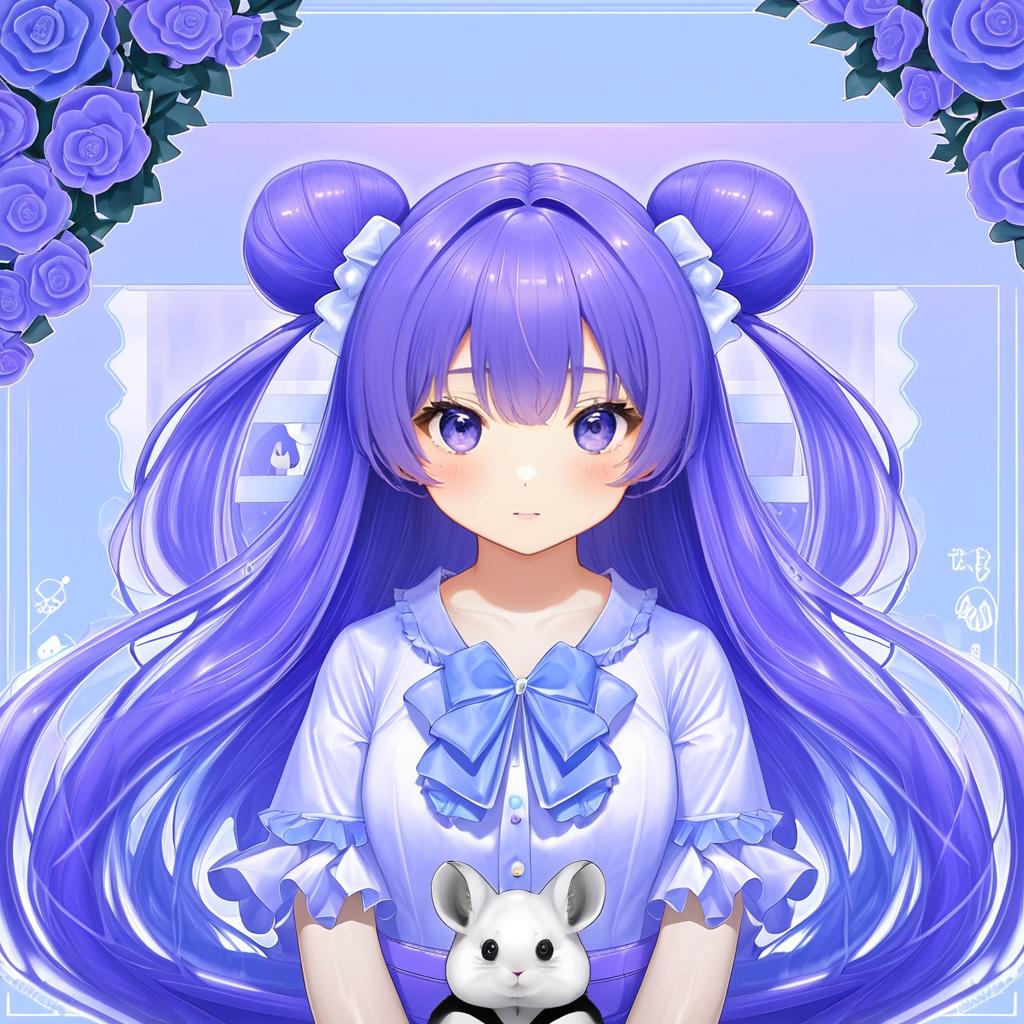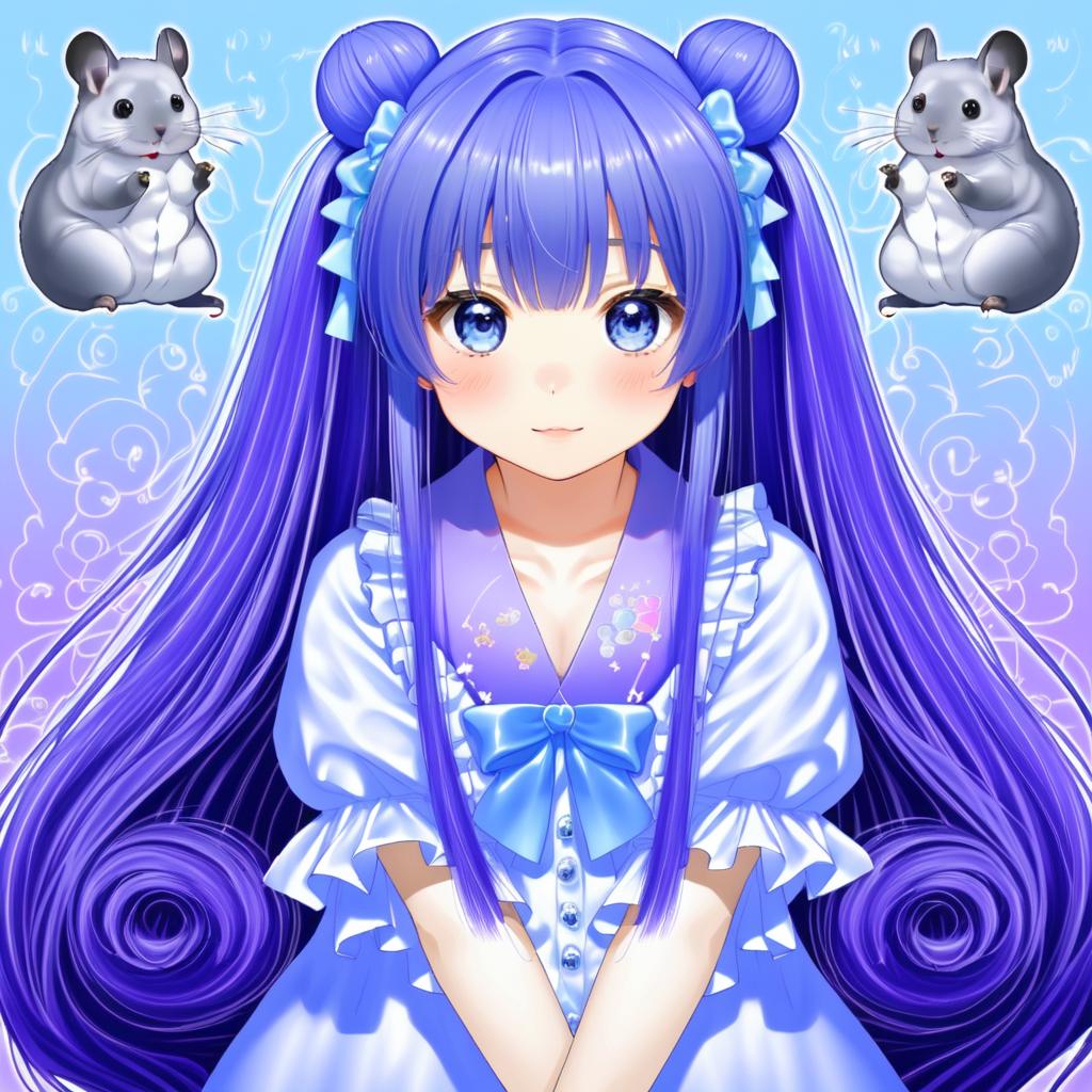 Amamiya shizuku (hizuki yayoi), original, 1girl, hair between eyes, blue eyes, purple eyes, purple hair, very long hair, blue hair, two side up, double bun, hair bow, medium breasts, collarbone, white shirt, blue bow, chinchilla (animal), animal, by artist toutenkou, illustrious