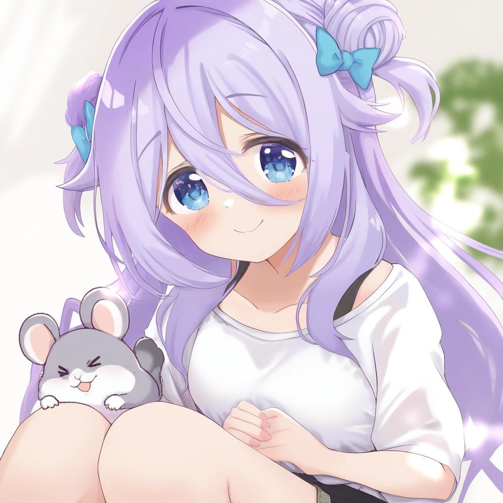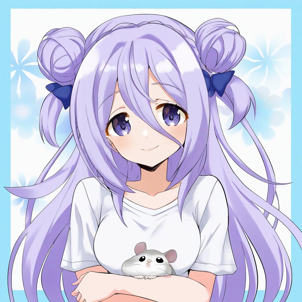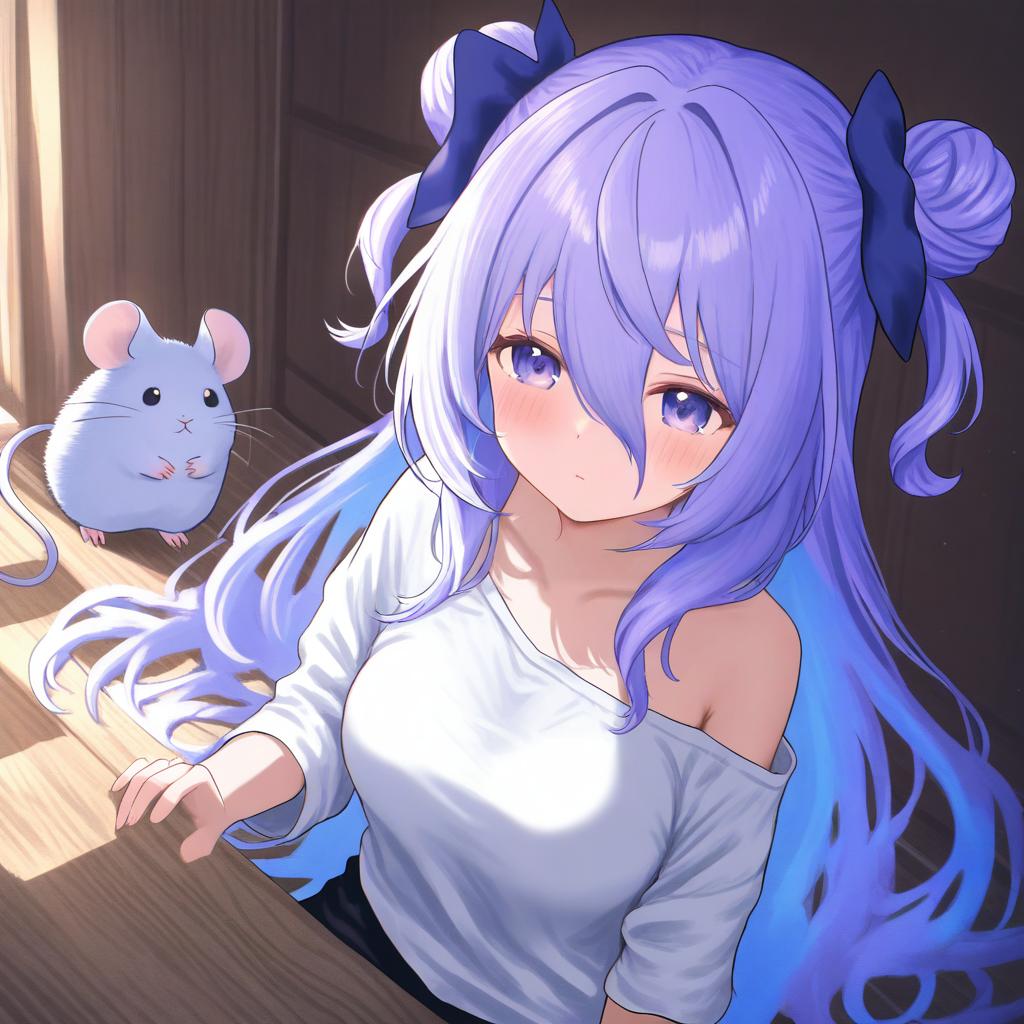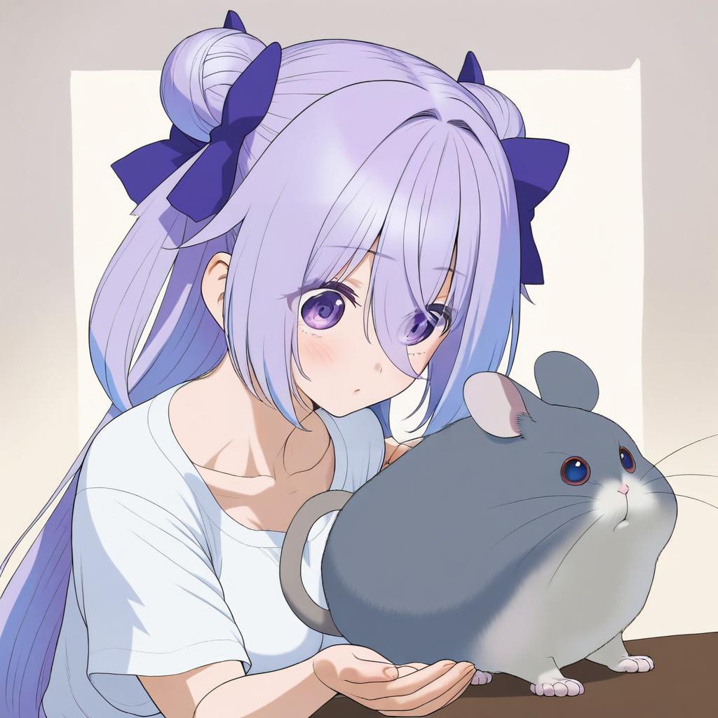 Amamiya shizuku (hizuki yayoi), original, 1girl, hair between eyes, blue eyes, purple eyes, purple hair, very long hair, blue hair, two side up, double bun, hair bow, medium breasts, collarbone, white shirt, blue bow, chinchilla (animal), animal, by artist toutenkou, illustrious