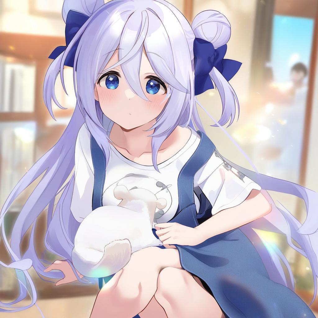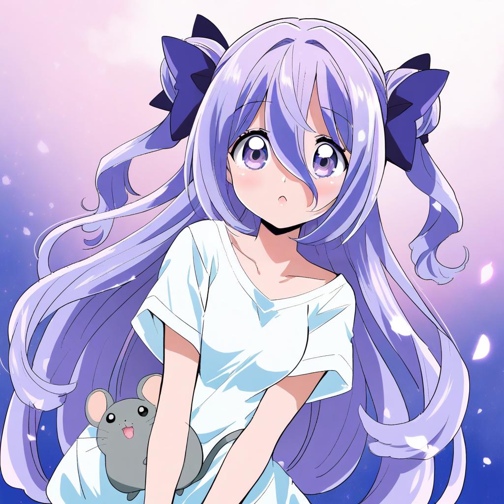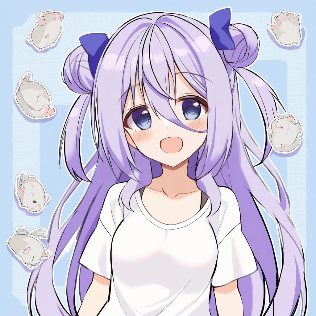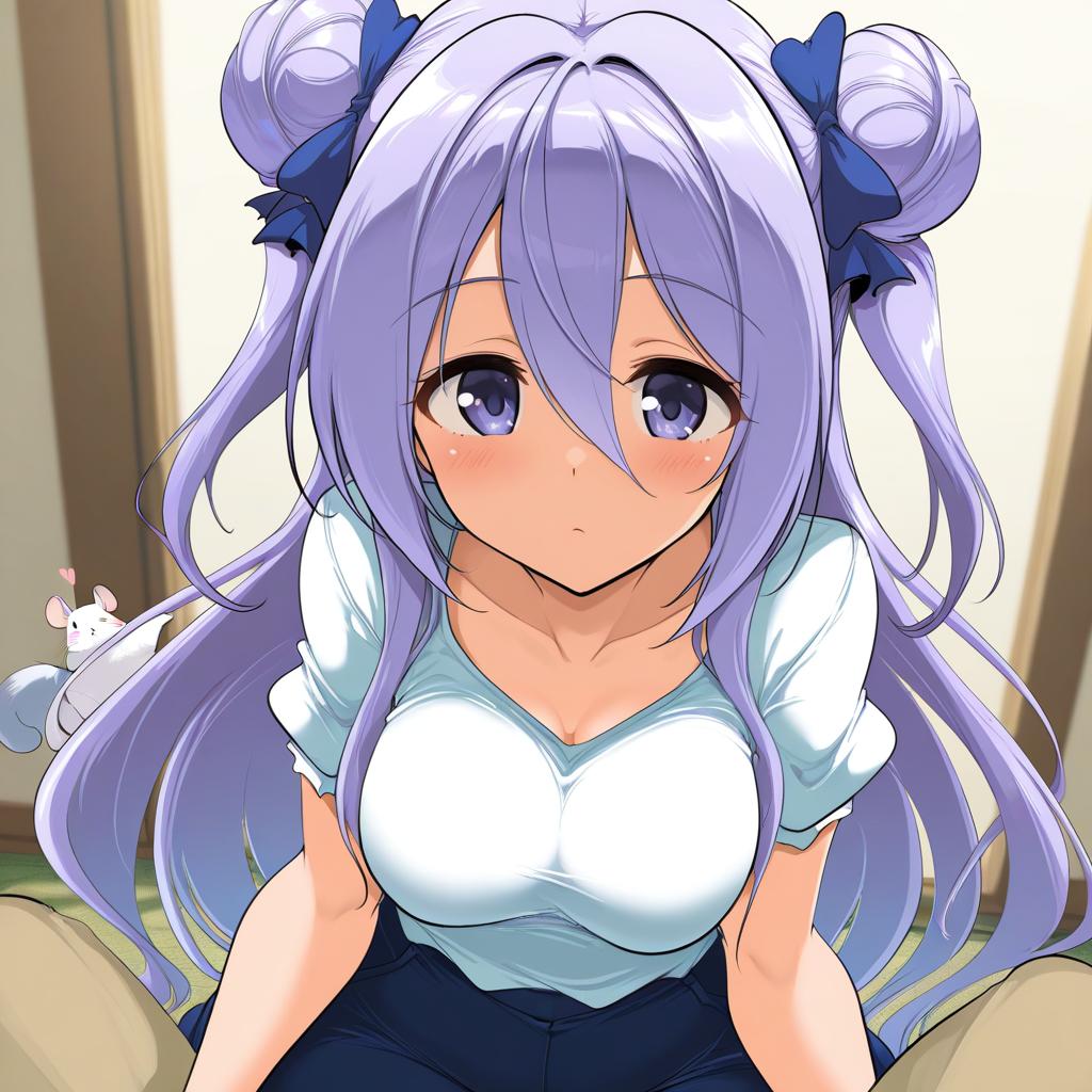 Amamiya shizuku (hizuki yayoi), original, 1girl, hair between eyes, blue eyes, purple eyes, purple hair, very long hair, blue hair, two side up, double bun, hair bow, medium breasts, collarbone, white shirt, blue bow, chinchilla (animal), animal, by artist toutenkou, illustrious