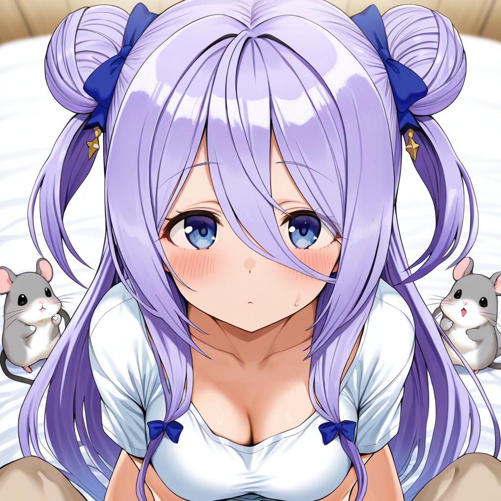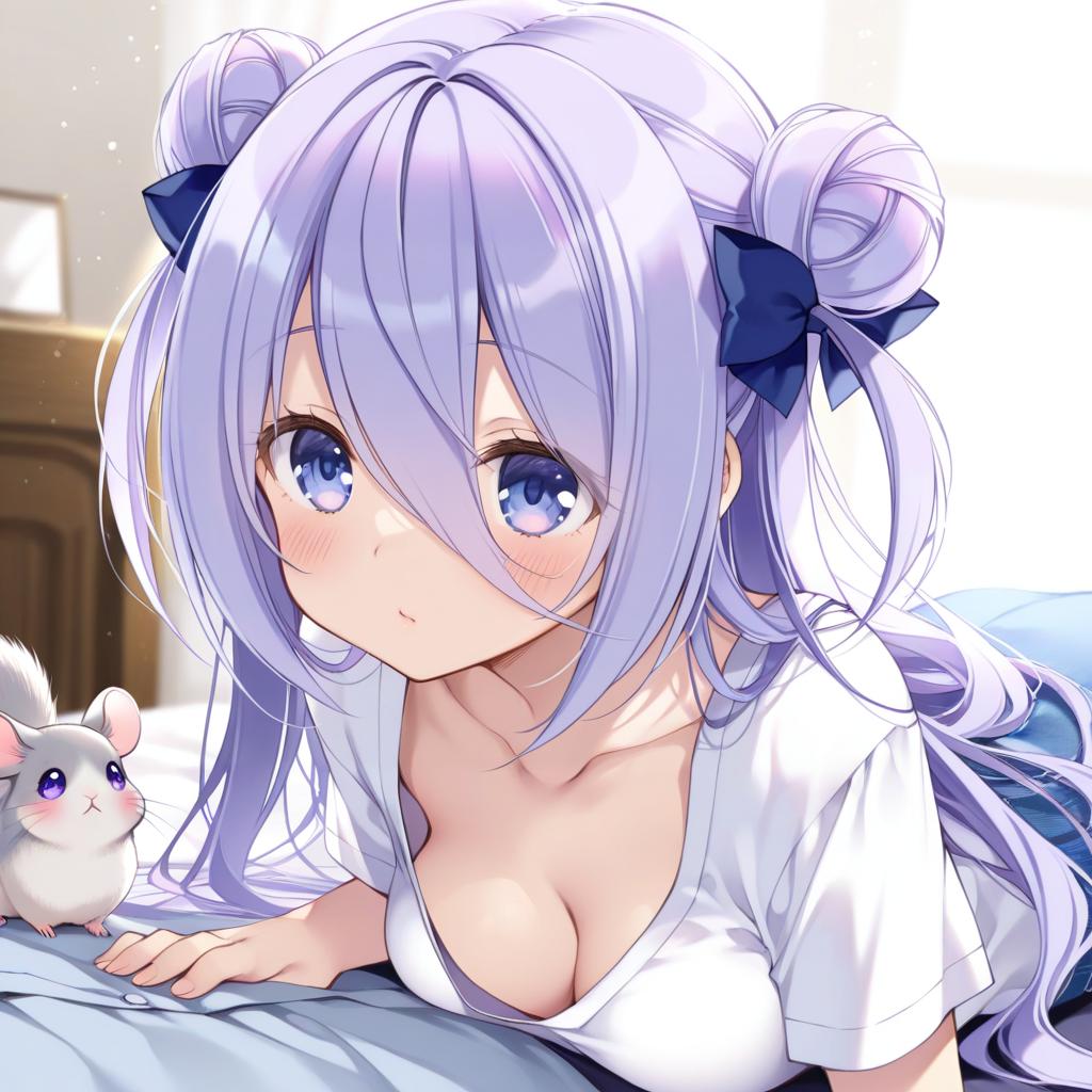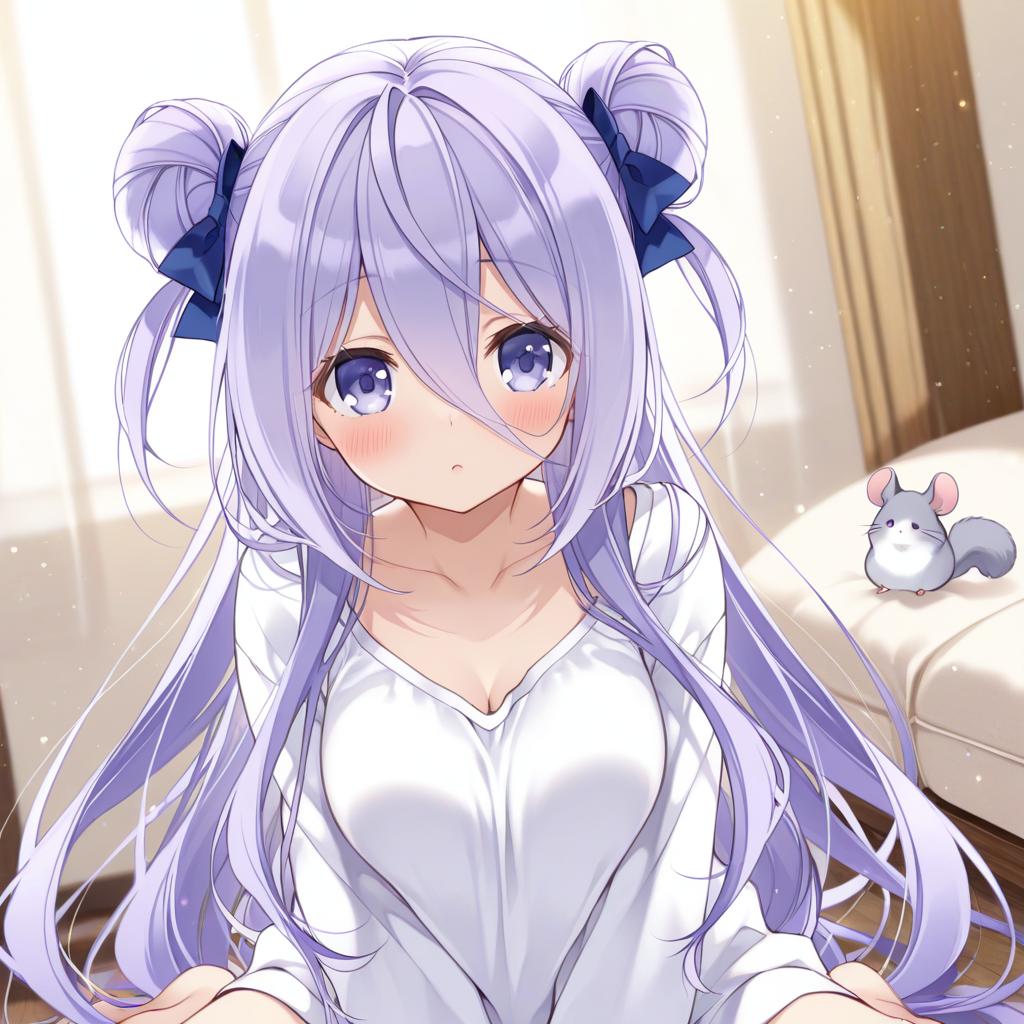 Digital anime-style illustration of a young girl with very long purple hair styled in two side buns with blue bows. She has blue and purple eyes partially covered by her hair and a white shirt revealing her collarbone. Next to her on the bed is a cute chinchilla with purple eyes. The setting appears to be indoors with soft natural light.