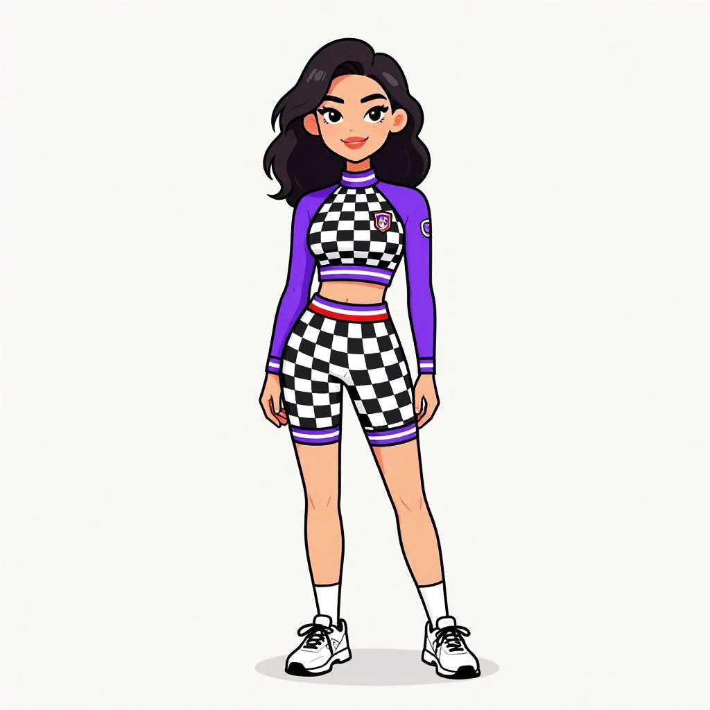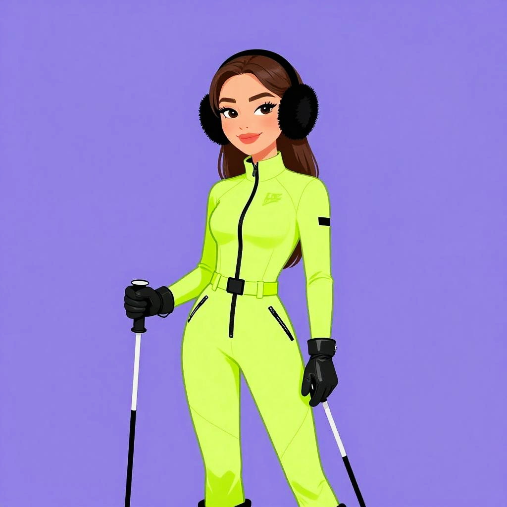 Woman with pretty face and pretty hair. smiling Woman, sporty chic, white fitted ski jacket with black accents, stand-up collar, belted waist, front zipper, matching white ski pants, straight cut, black ski gloves, black helmet with visor, black ski boots, photo studio background with a solid color. --sref 1467